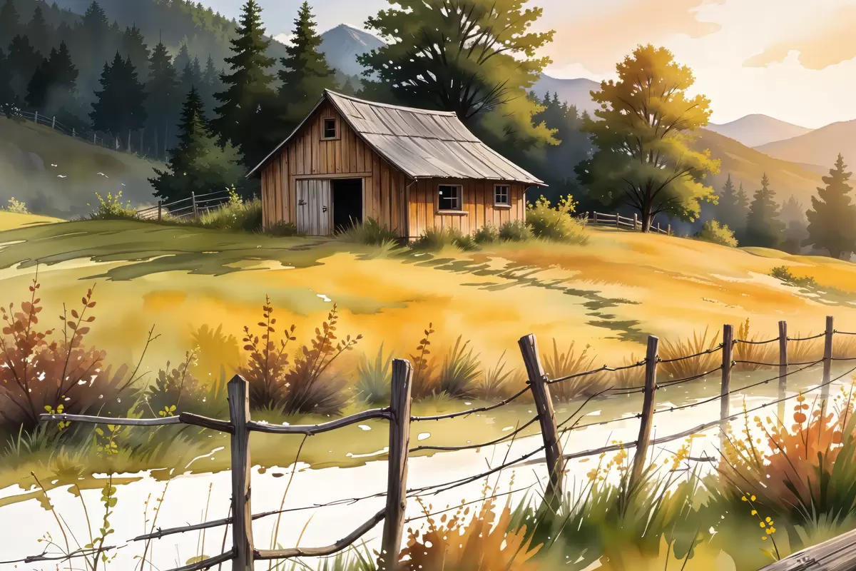 Wandbilder Ein altes Holzhaus in ländlicher Umgebung, umgeben von einer Wiese, Pinien und Bergen Art. s40394
