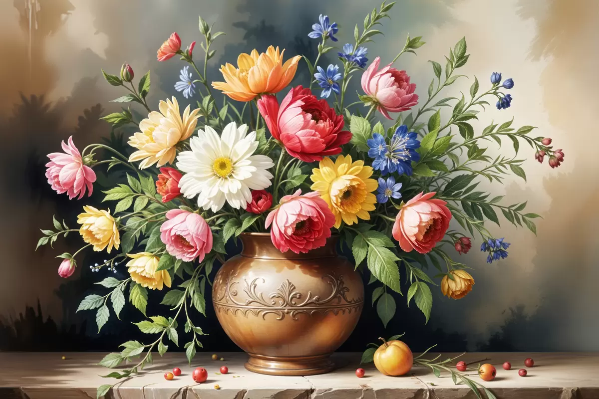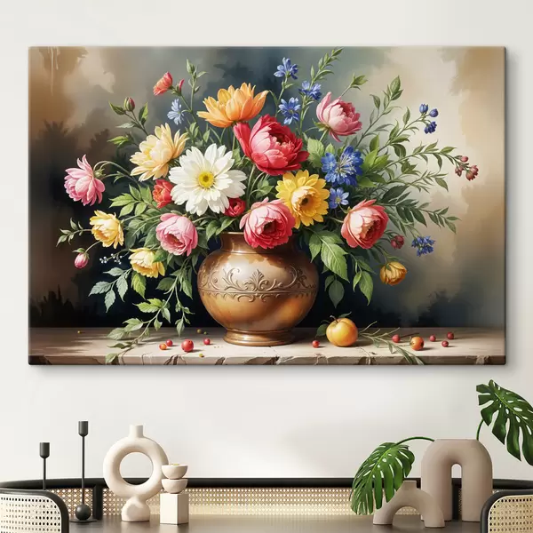 Wandbilder Ein lebendiges Gemälde eines Straußes bunter Blumen, darunter rote Rosen, gelbe Narzissen und weiße Gänseblümchen Art. s40395