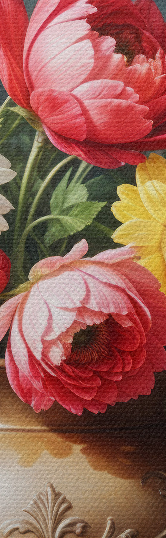 Drei Materialtypen stehen zur Verfügung: Economic Canvas - ein dichtes und haltbares Material für den Digitaldruck, identisch mit Malerleinwand, wasserfeste Oberfläche, realistische Wiedergabe von Details, mittelkörniges Material. Premium Canvas - die Textur ähnelt der einer Malerleinwand (verwobene kleine Fäden). Weiche, detaillierte Wiedergabe des Bildes auf einer matten Oberfläche. Eco-Premium - hochwertiges Gewebe aus 100% Baumwolle. Dank der natürlichen Baumwollfasern ist das Material langlebig und verschleißfest. Hervorragende Farbwiedergabe und Detailtreue.