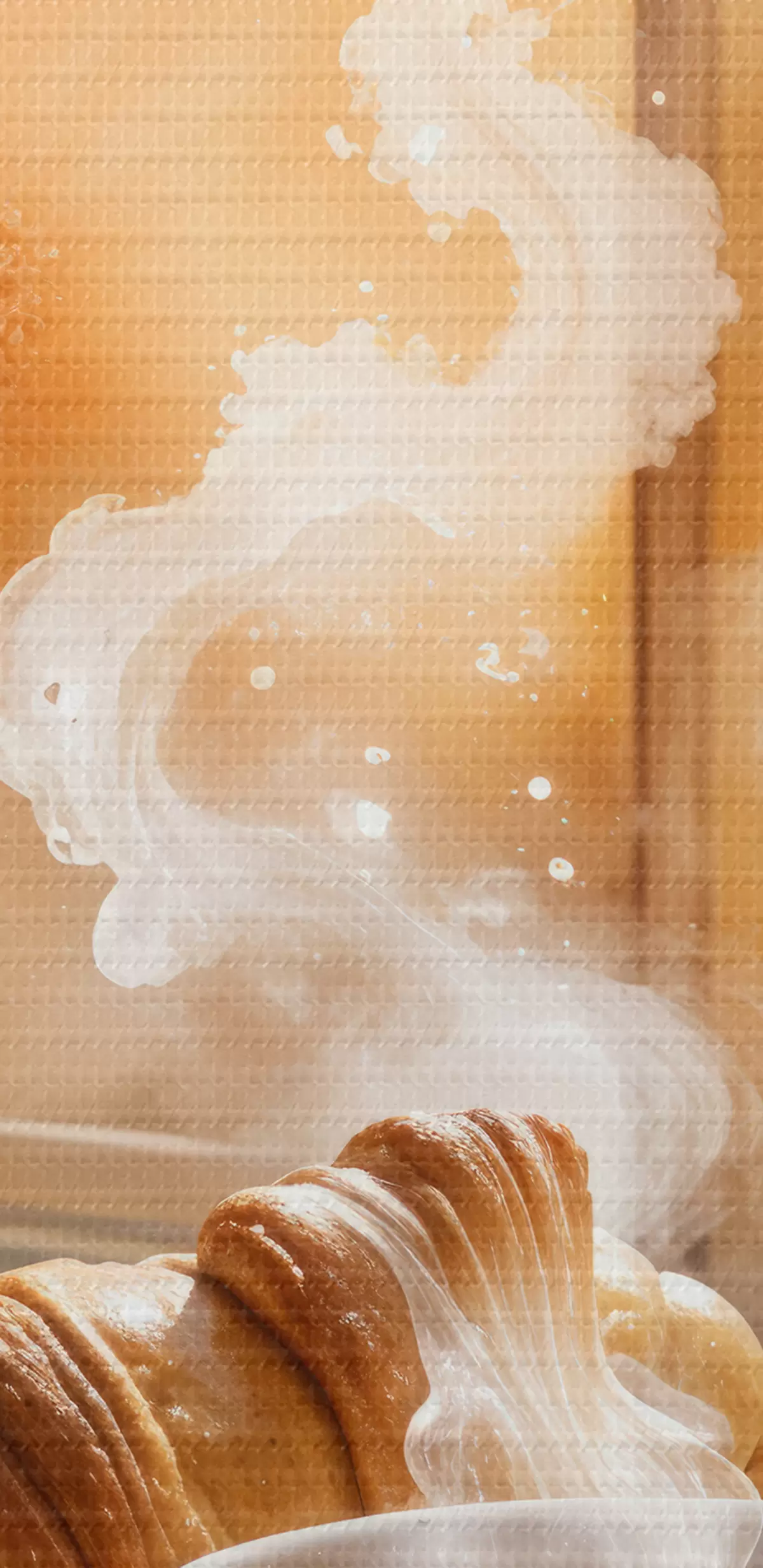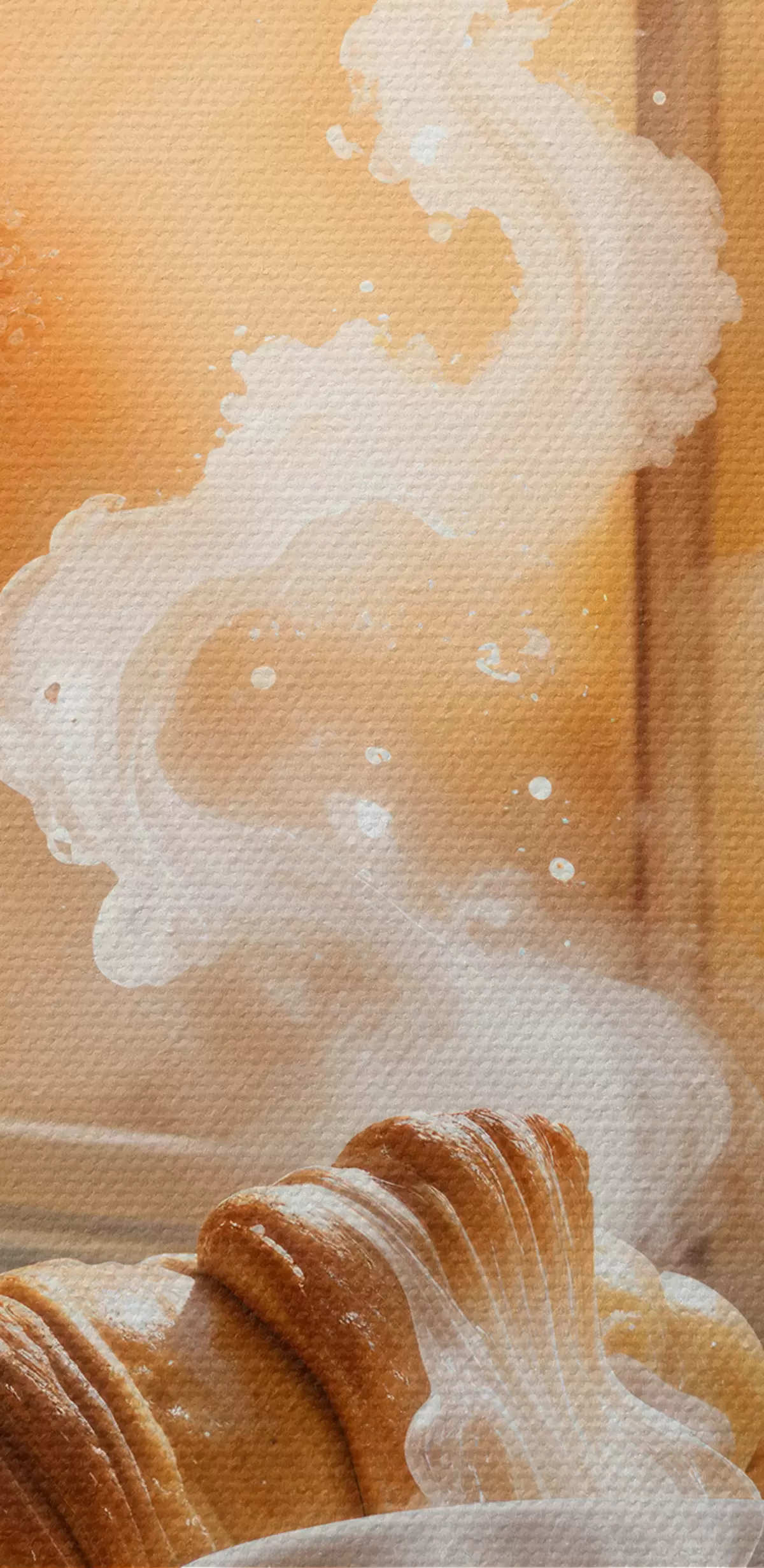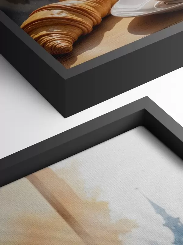 Wandbilder Eine warme Tasse Kaffee mit aufsteigendem Dampf, auf einem Tisch neben einem Croissant platziert, mit Blick auf ein historisches Gebäude Art. s40405