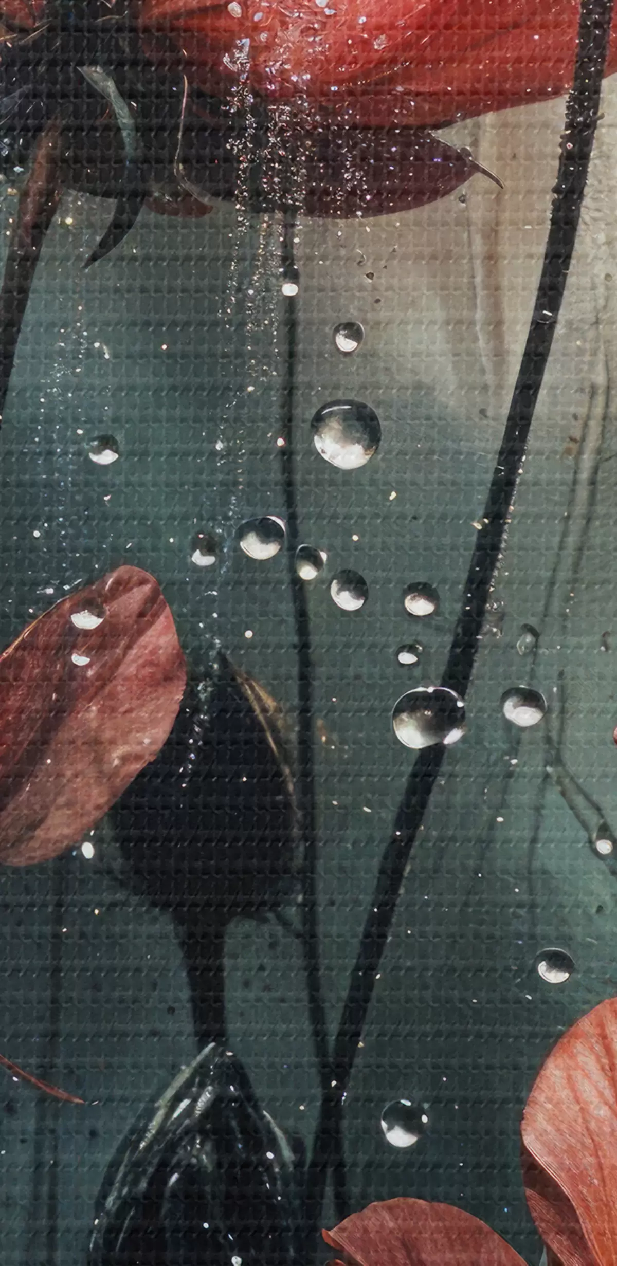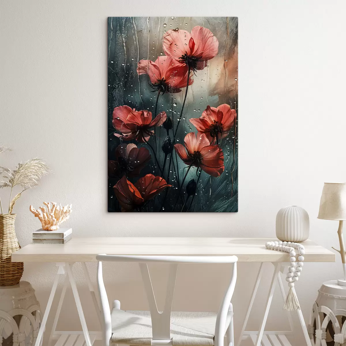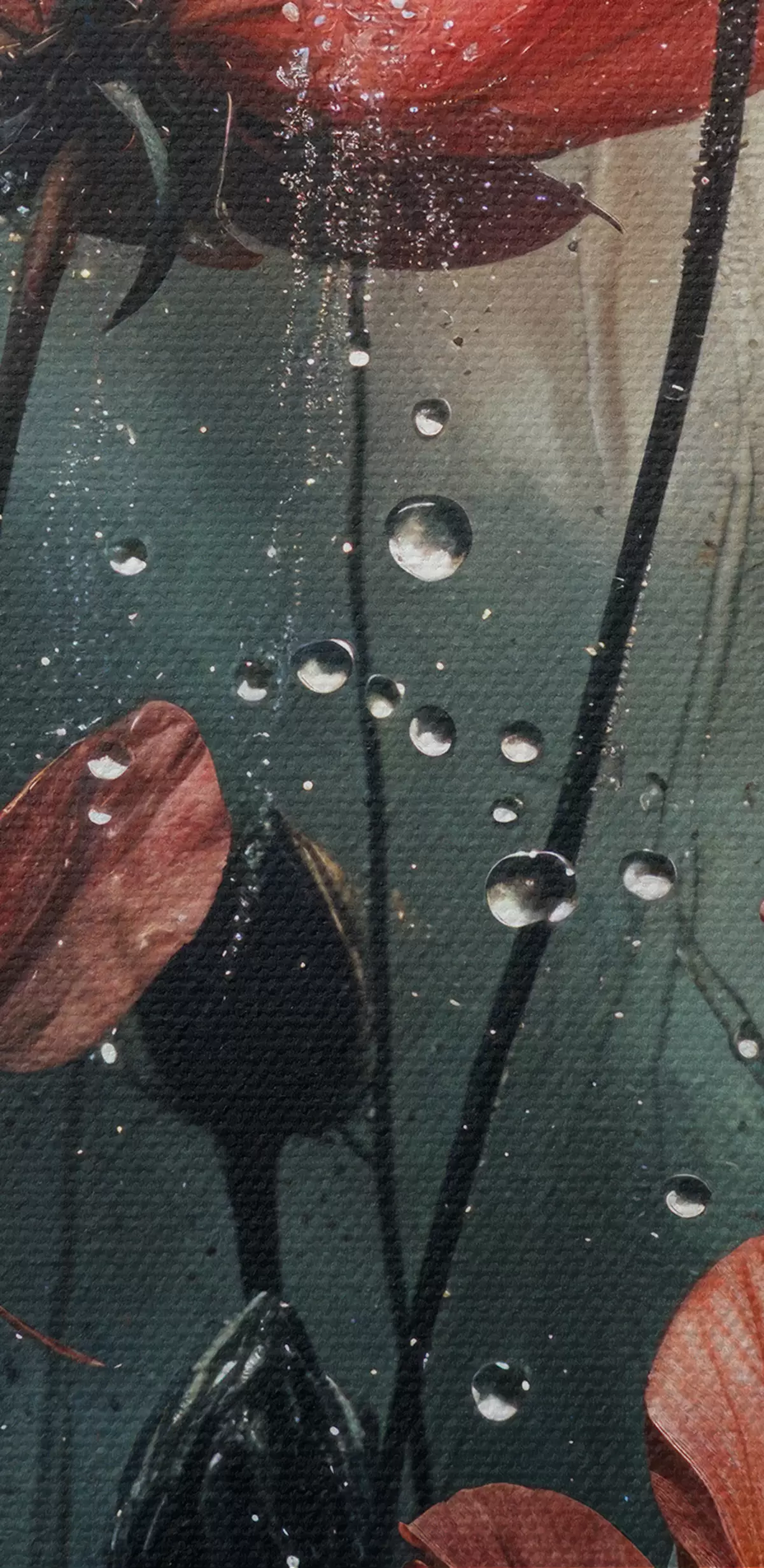 Wandbilder Rote Blüten mit Wassertropfen vor einem unscharfen Hintergrund Art. s40412