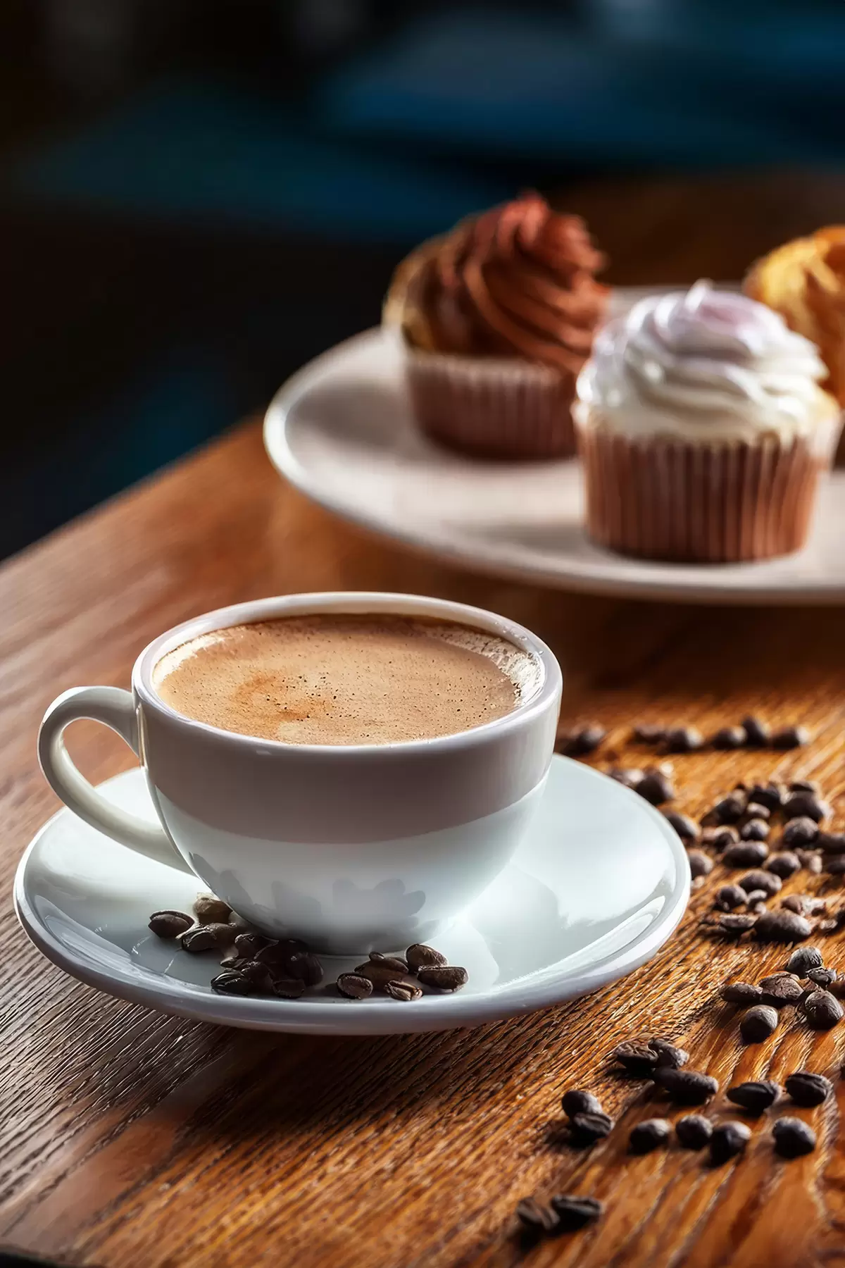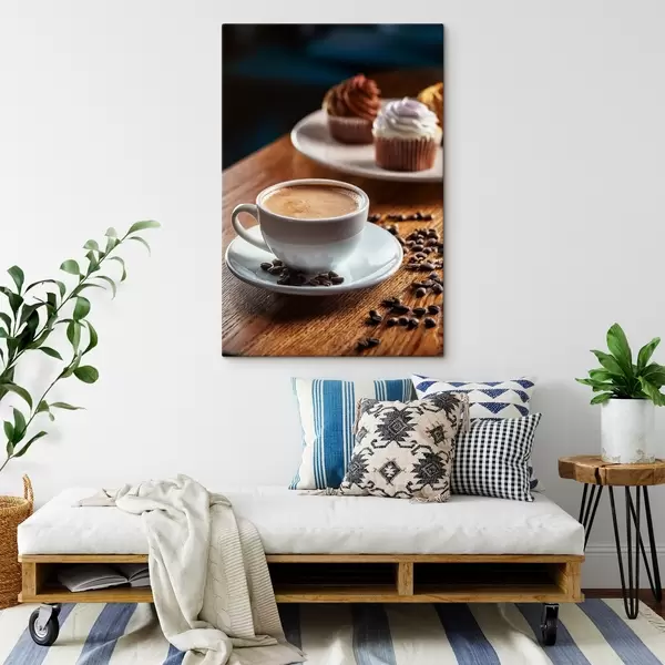 Wandbilder Tasse Kaffee, Kaffeebohnen, Kuchen, Stillleben s40417