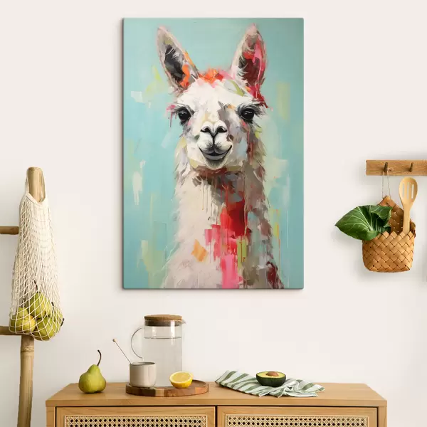 Wandbilder Weißes Lama mit Farbflecken auf pastellblau-grauem Hintergrund Art. s40523