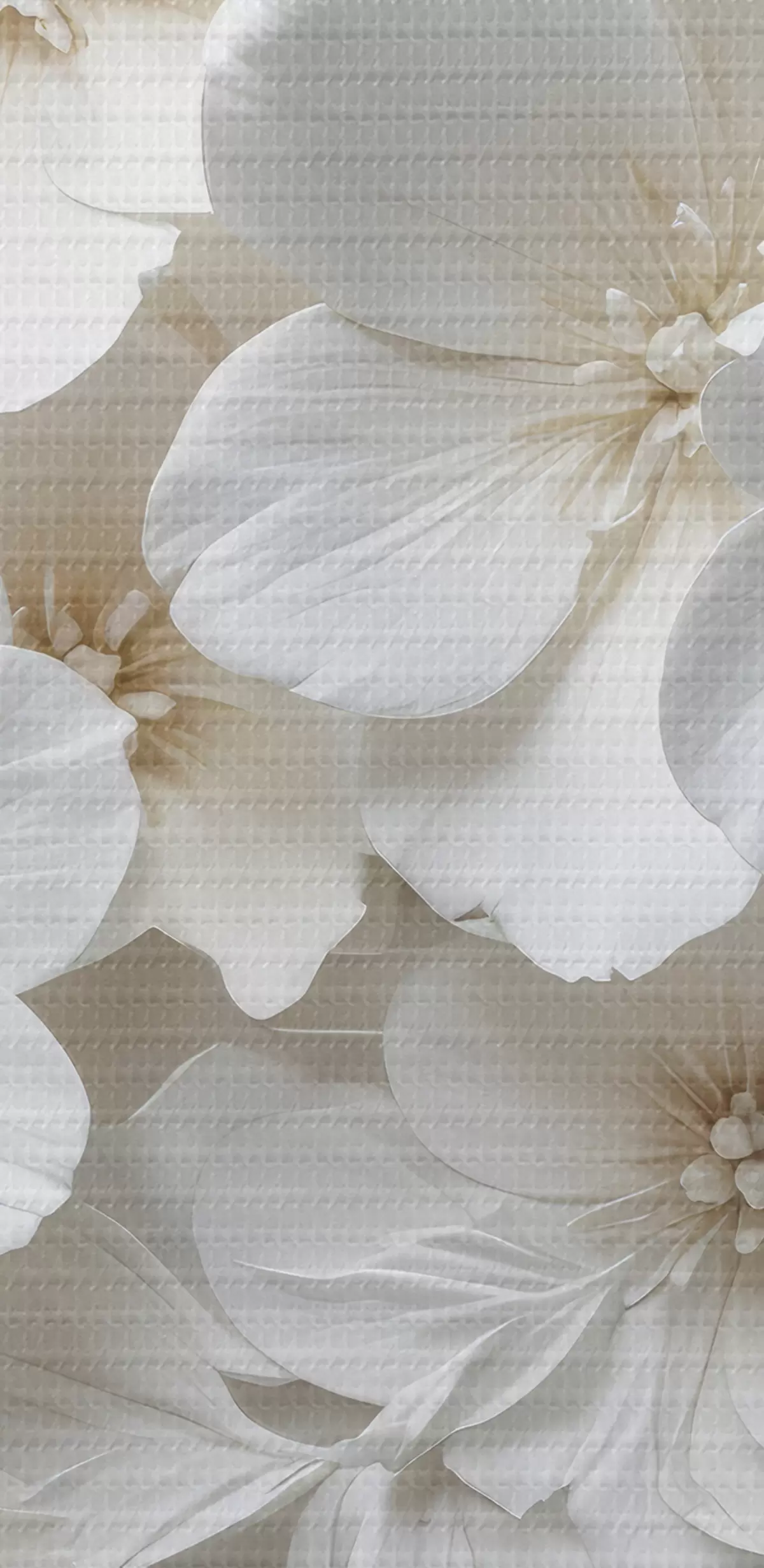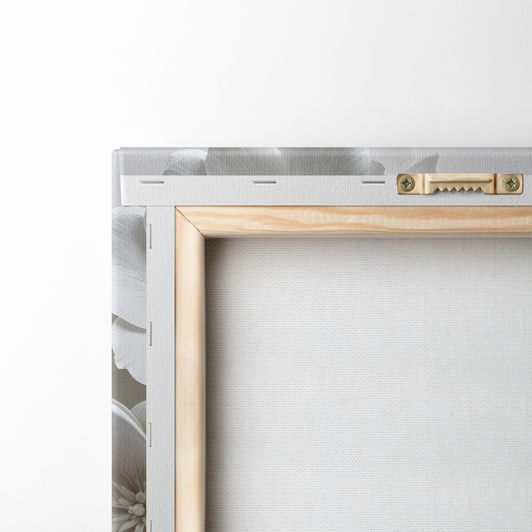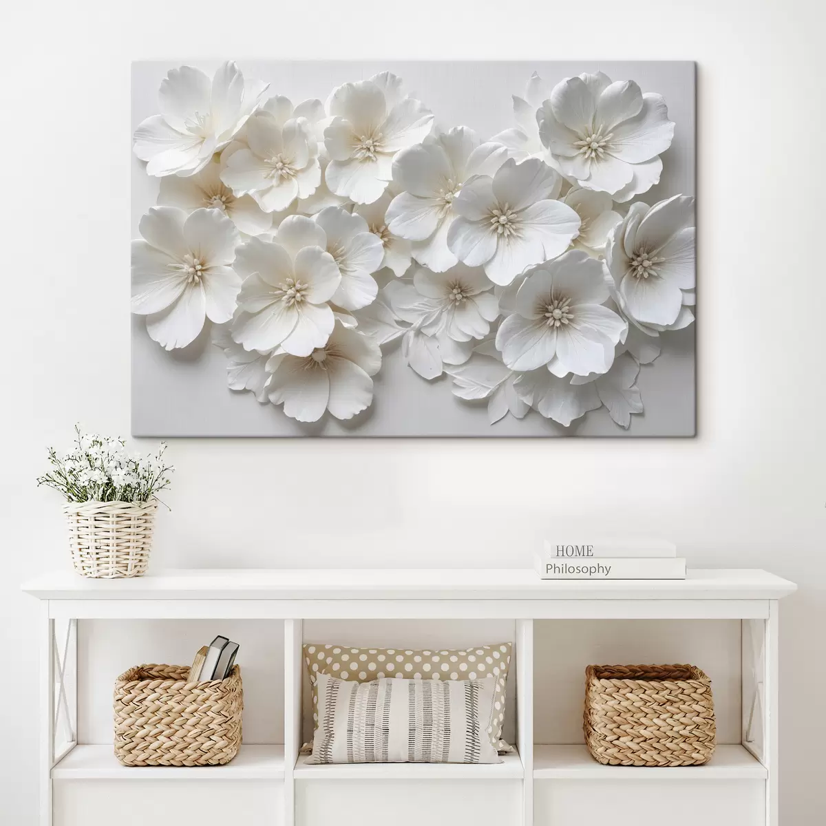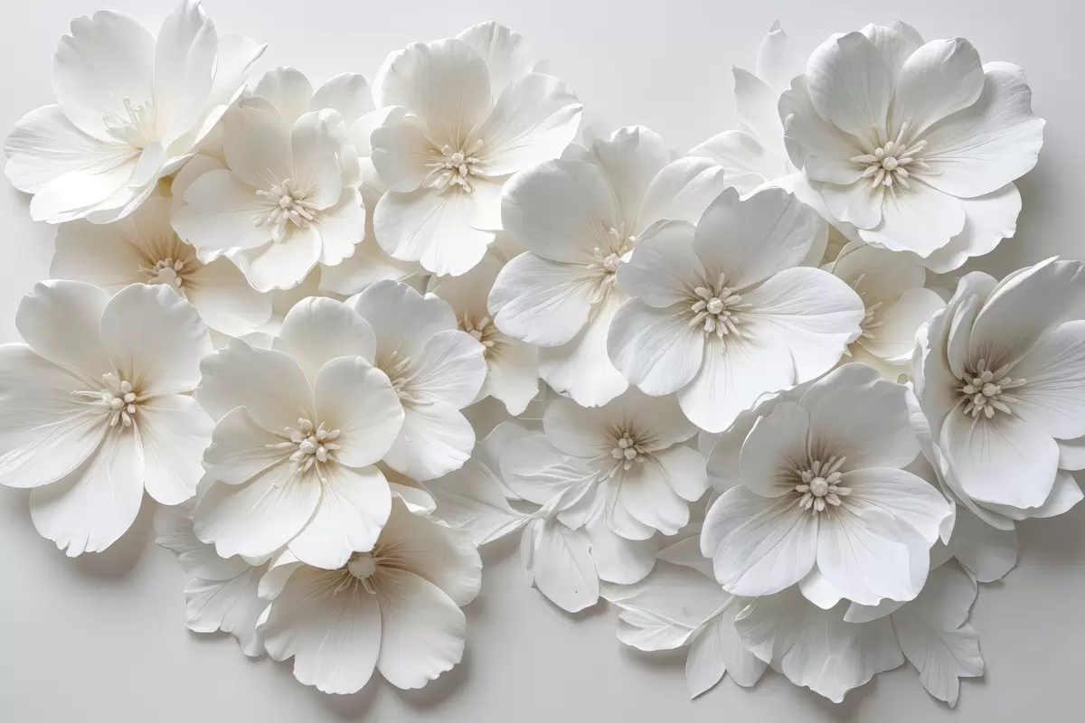 Wandbilder Weiße Blüten mit zarten Blütenblättern, angeordnet in einem wunderschönen Blumenmuster vor einem hellen Hintergrund Art. s40548