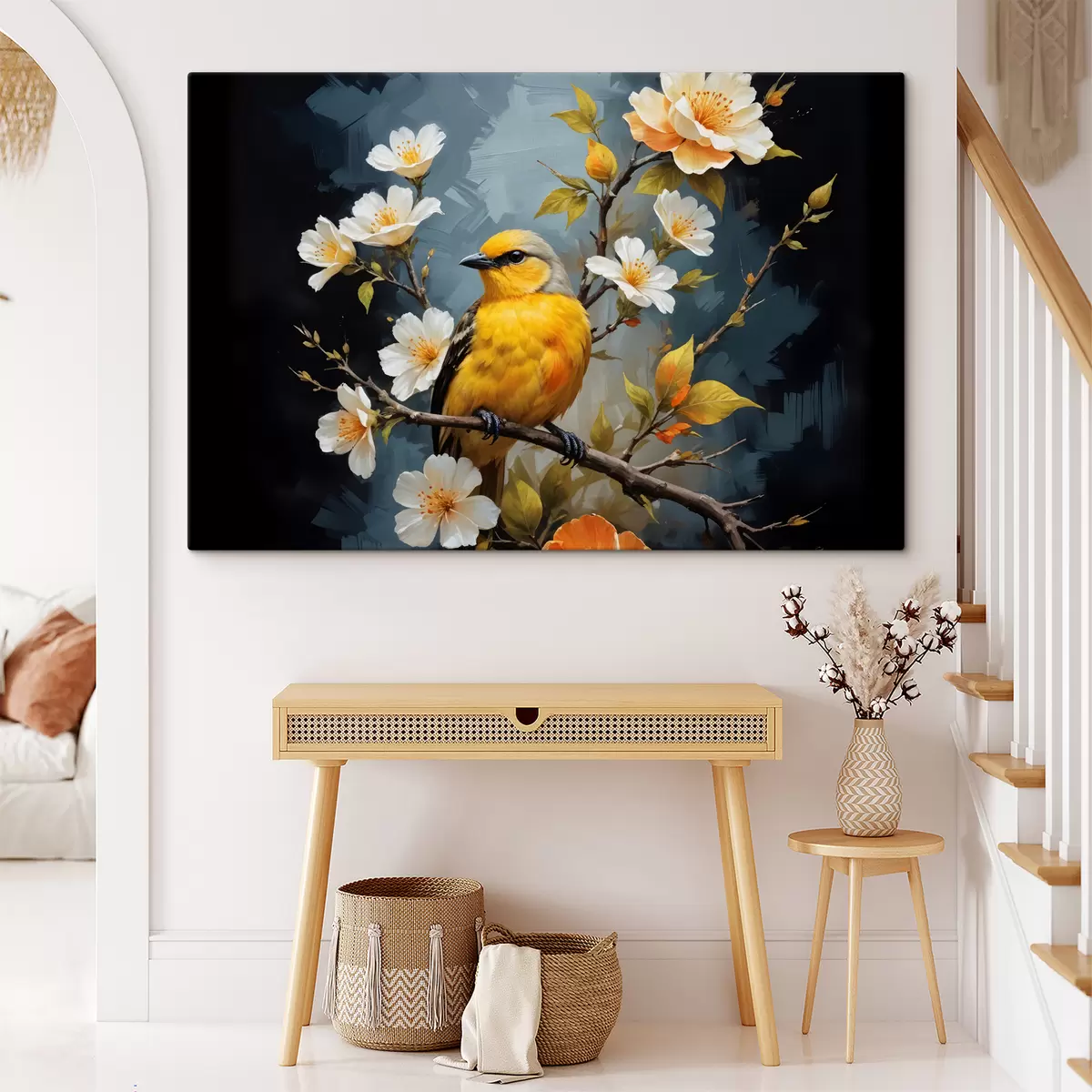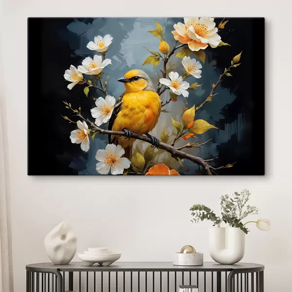 Wandbilder Ein gelber Vogel auf einem Ast mit weißen und orangefarbenen Blüten im Hintergrund Art. s40550