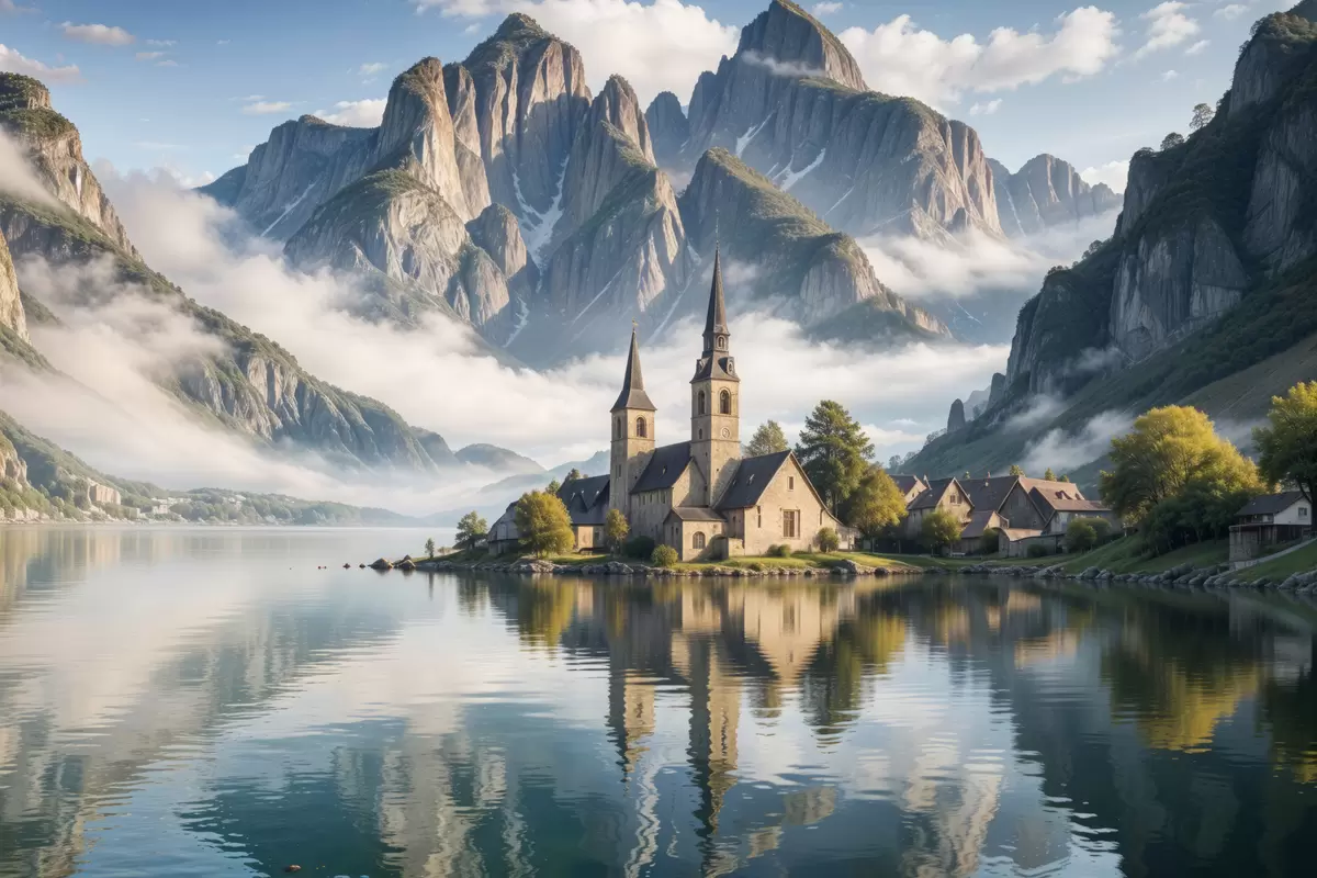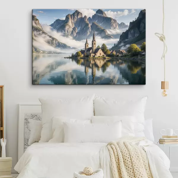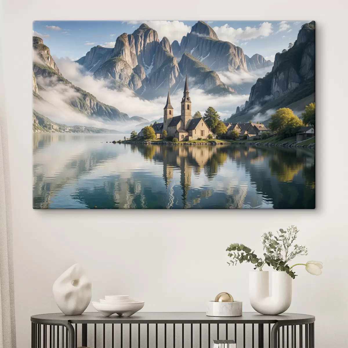 Wandbilder Ein malerisches Bergdorf an einem ruhigen See mit hoch aufragenden schneebedeckten Bergen Art. s40554