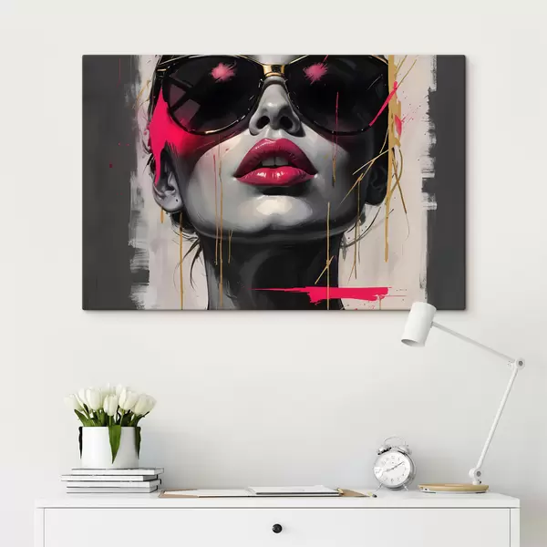Wandbilder Abstraktes Porträt einer jungen Frau mit Sonnenbrille, rosa Lippen, abstrakten Formen und Spritzern in Rosa Art. s40558