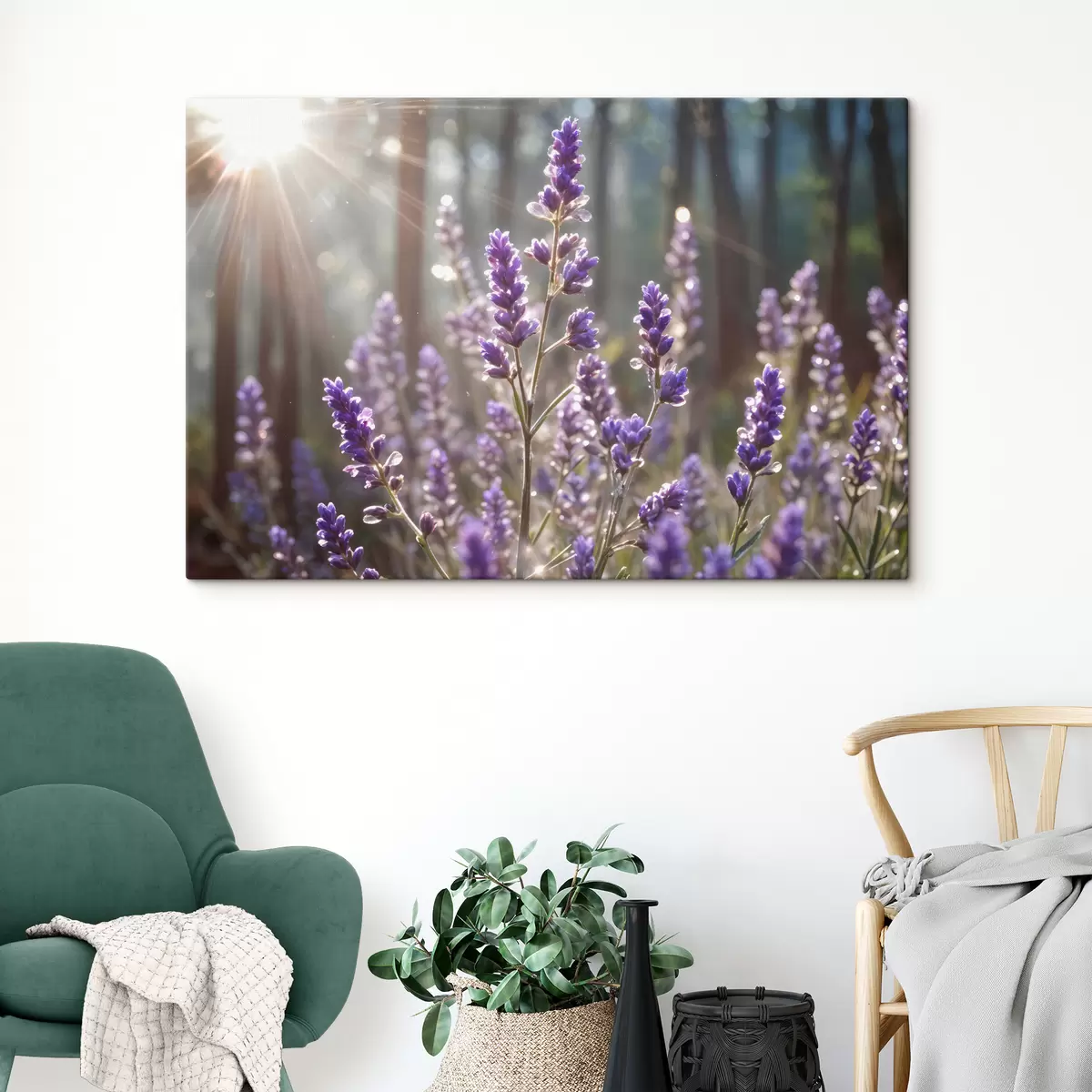 Wandbilder Lila Lavendelblüten auf einem Feld mit verschwommenem Waldhintergrund und durchfallendem Sonnenlicht Art. s40570