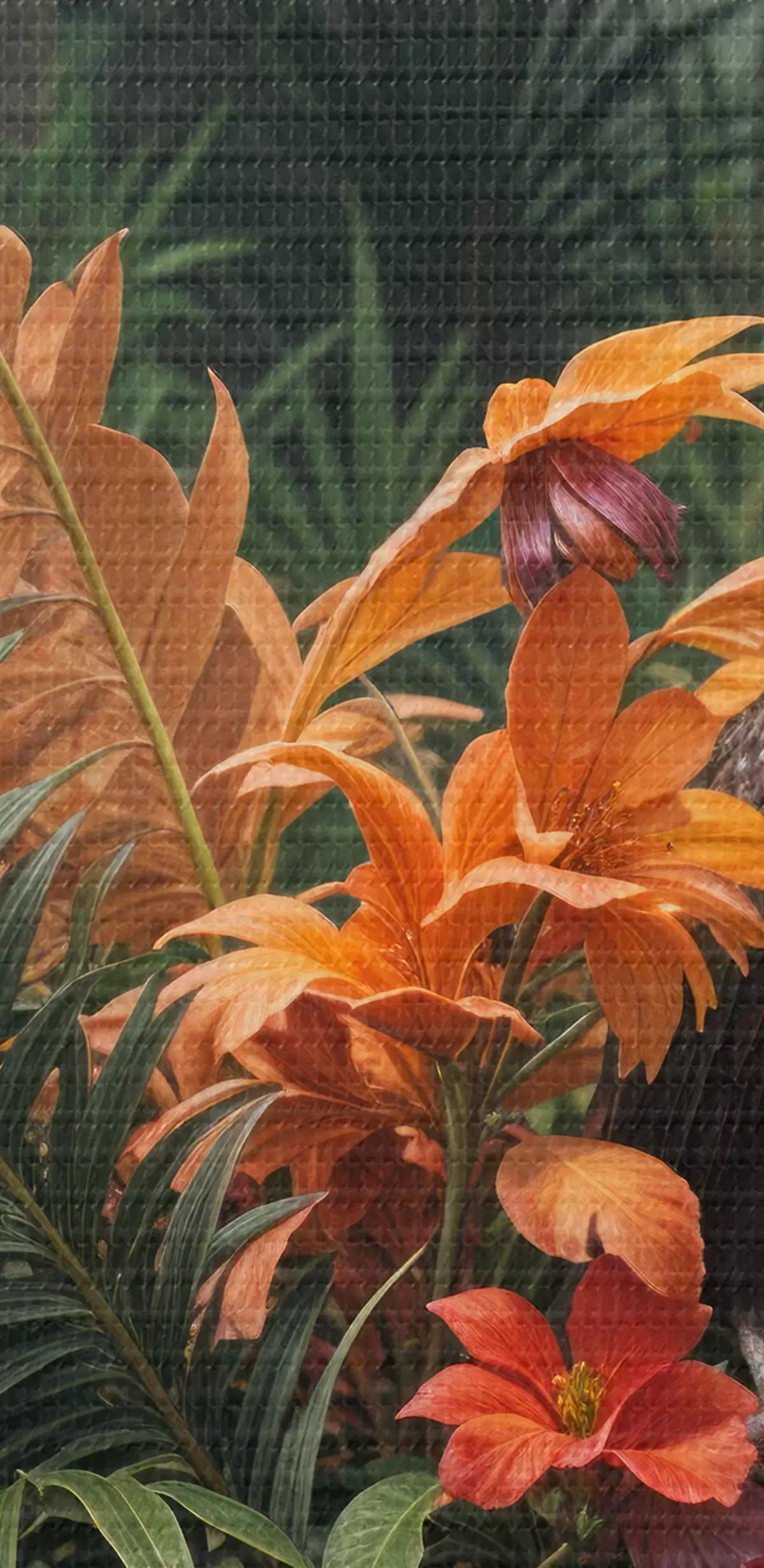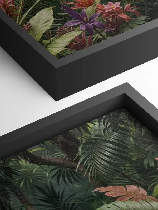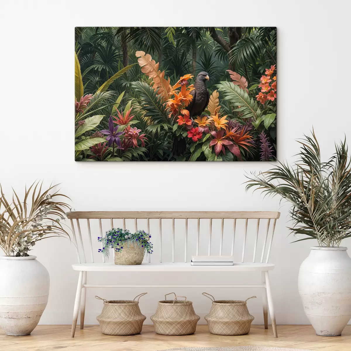 Wandbilder Tropischer Vogel auf einem Ast, umgeben von leuchtendem Laub, Palmblättern, Blumen und exotischen Pflanzen Art. s40578