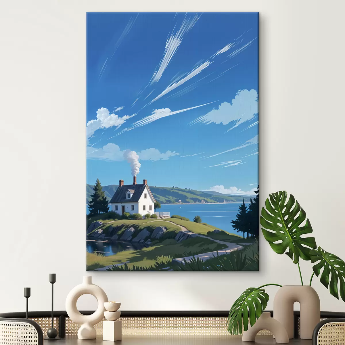Wandbilder Ein weißes Haus auf einem grasbewachsenen Hügel mit Bergen im Hintergrund und einem blauen Himmel mit Wolkenfetzen Art. s40587