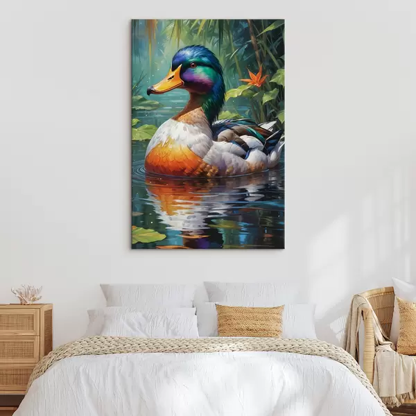 Wandbilder Eine bunte männliche Mandarinente schwimmt in einem Teich mit üppigem grünen Laub und gefallenen Herbstblättern Art. s40594