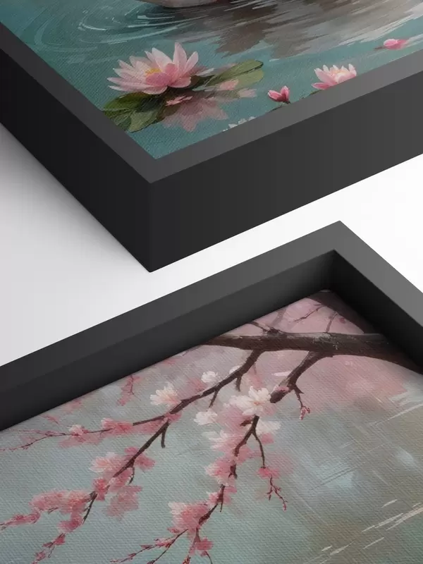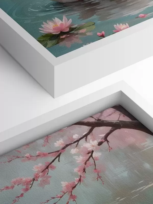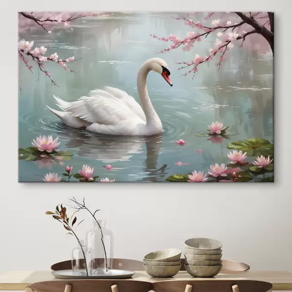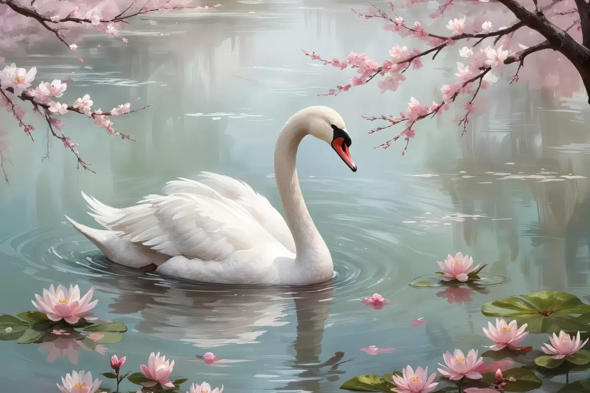 Wandbilder Ein anmutiger weißer Schwan schwimmt in einem ruhigen Teich, umgeben von blühenden rosa Kirschblütenbäumen s40597