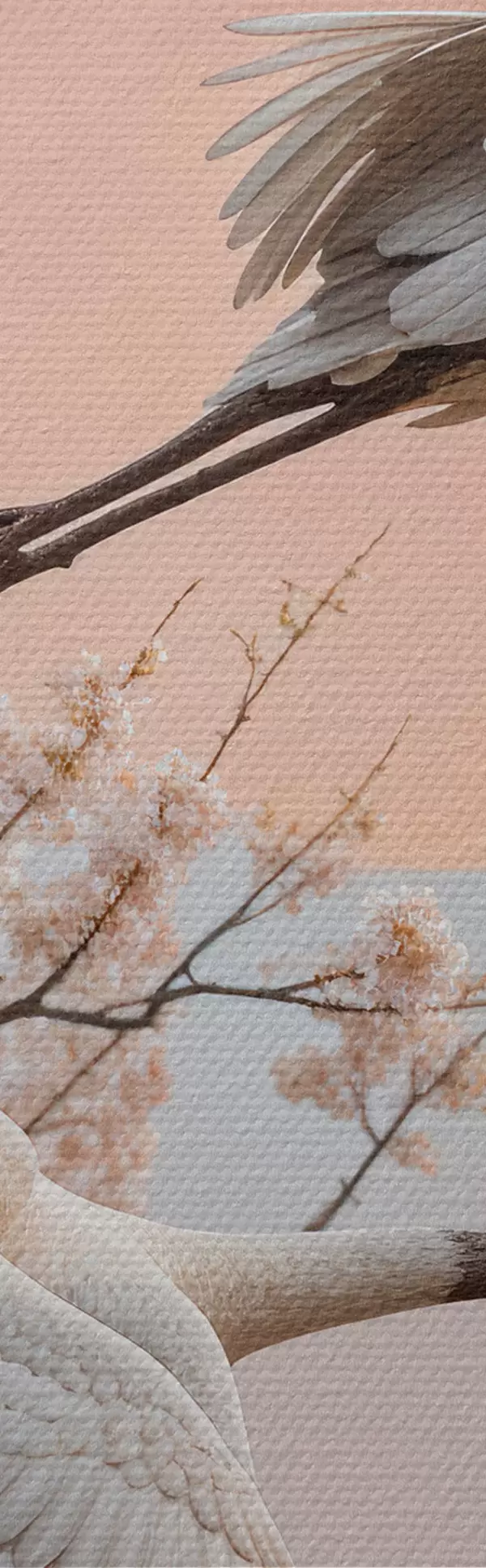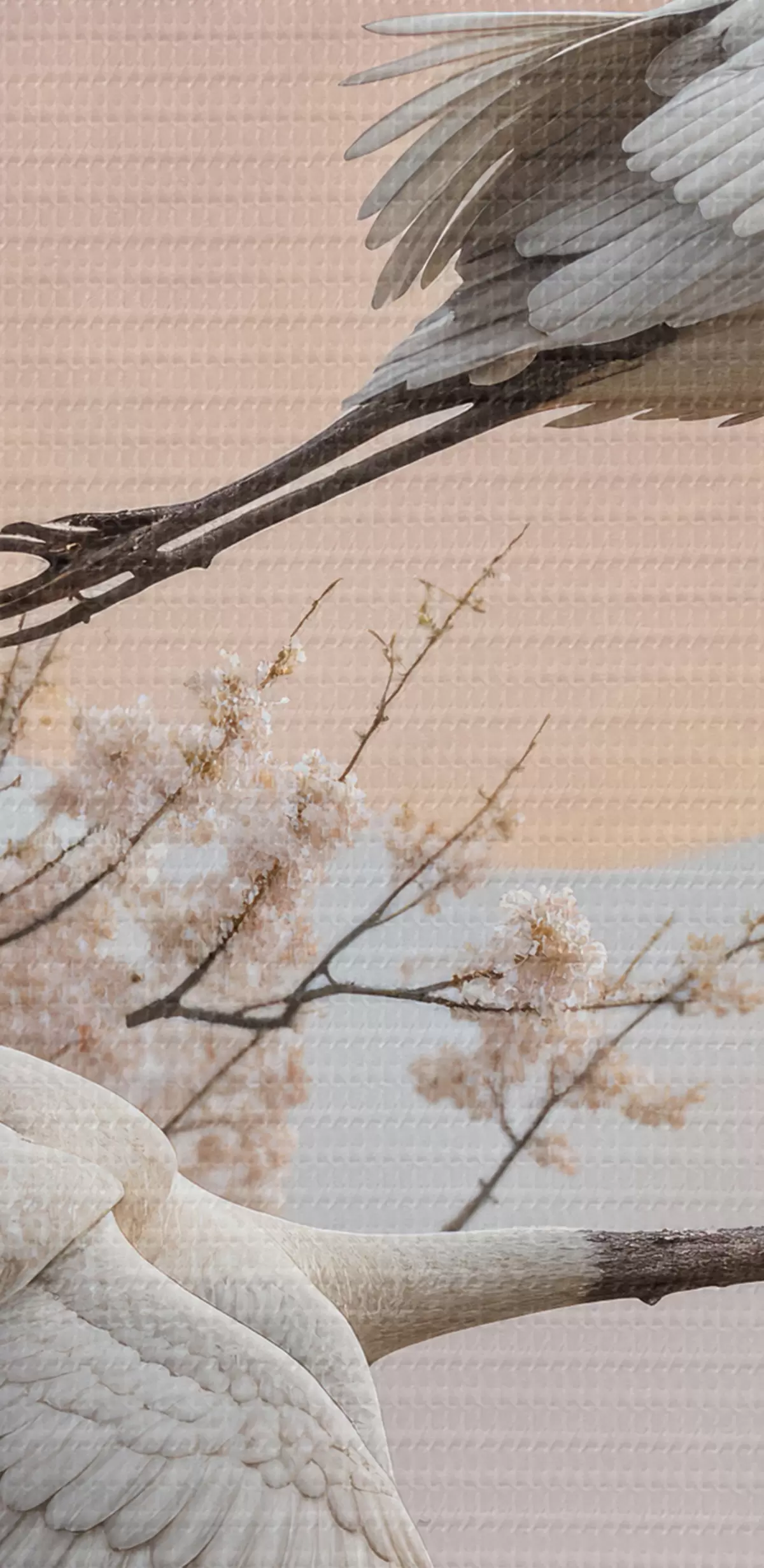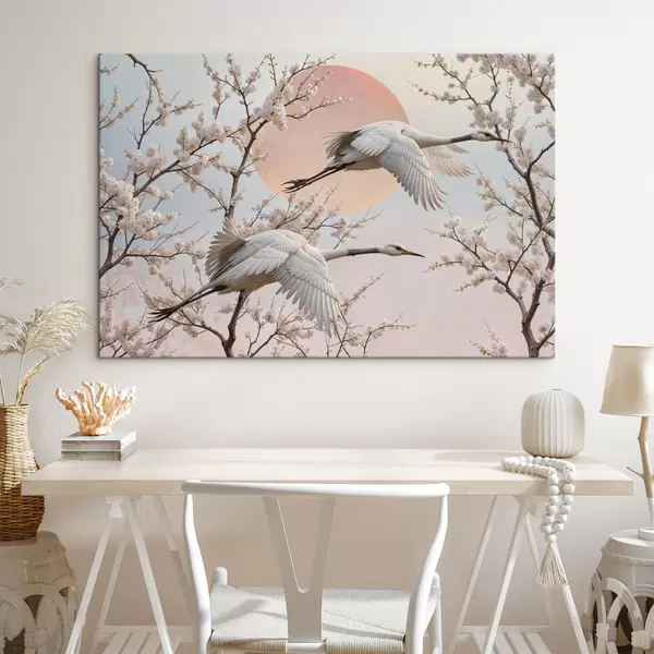 Wandbilder Zwei weiße Kraniche fliegen zwischen den blühenden Kirschblütenbäumen vor einem rosafarbenen Sonnenuntergangshimmel Art. s40601