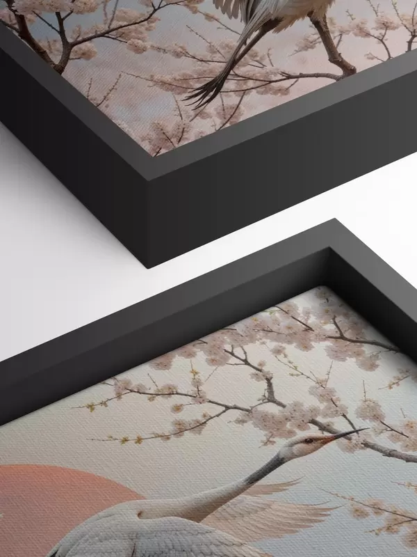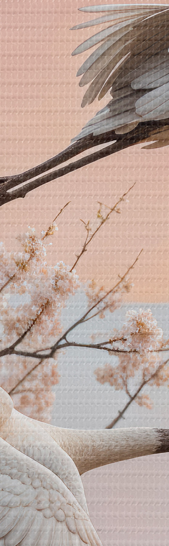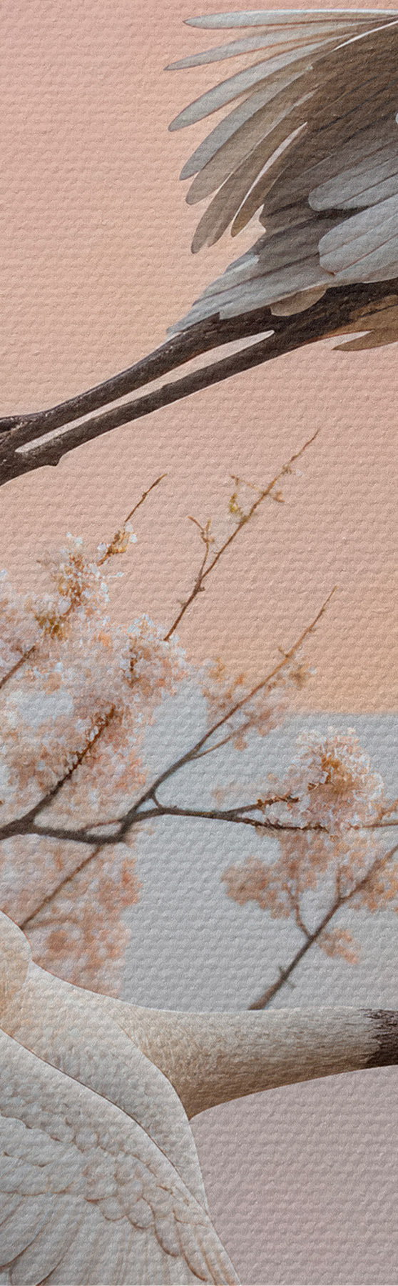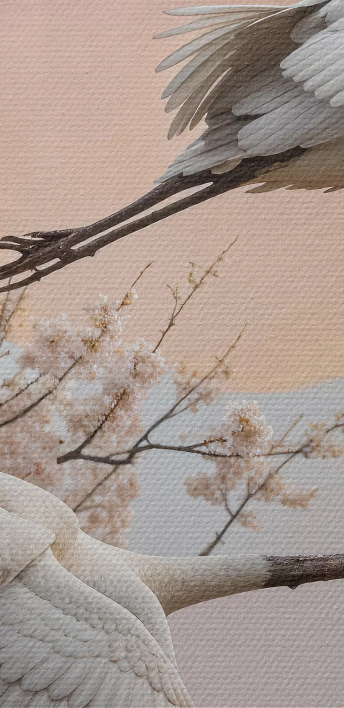 Wandbilder Zwei weiße Kraniche fliegen zwischen den blühenden Kirschblütenbäumen vor einem rosafarbenen Sonnenuntergangshimmel Art. s40601