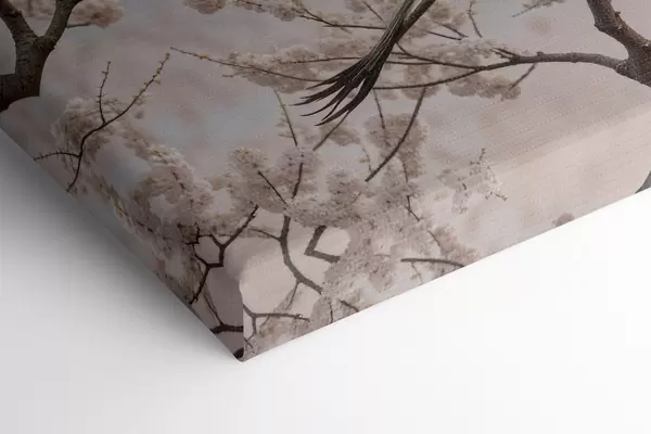 Wandbilder Zwei weiße Kraniche fliegen zwischen den blühenden Kirschblütenbäumen vor einem rosafarbenen Sonnenuntergangshimmel Art. s40601
