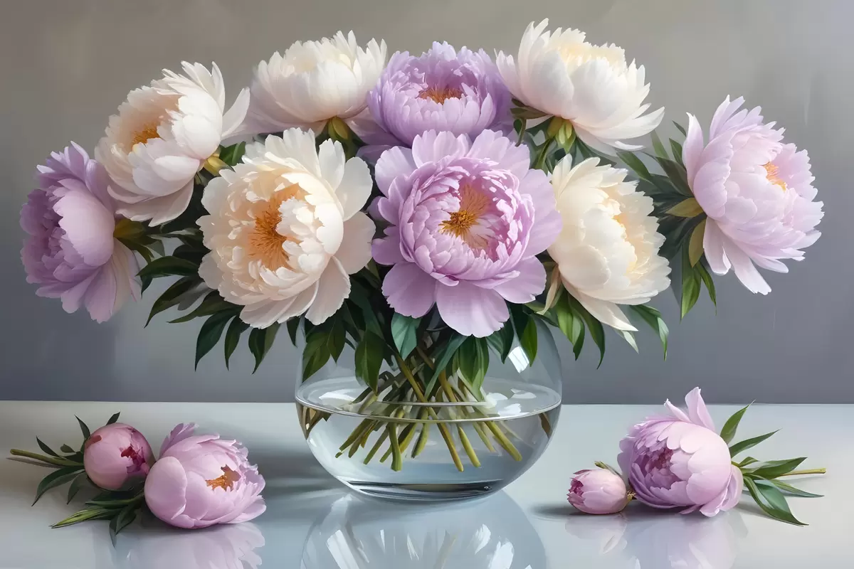 Wandbilder Ein Strauß großer, üppiger weißer und rosa Pfingstrosen in einer Glasvase auf grauem Hintergrund Art. s40610