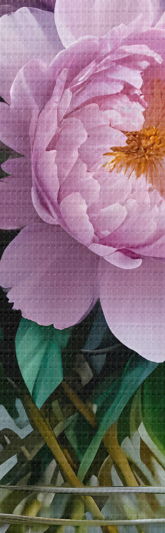Wandbilder Ein Strauß großer, üppiger weißer und rosa Pfingstrosen in einer Glasvase auf grauem Hintergrund s40610