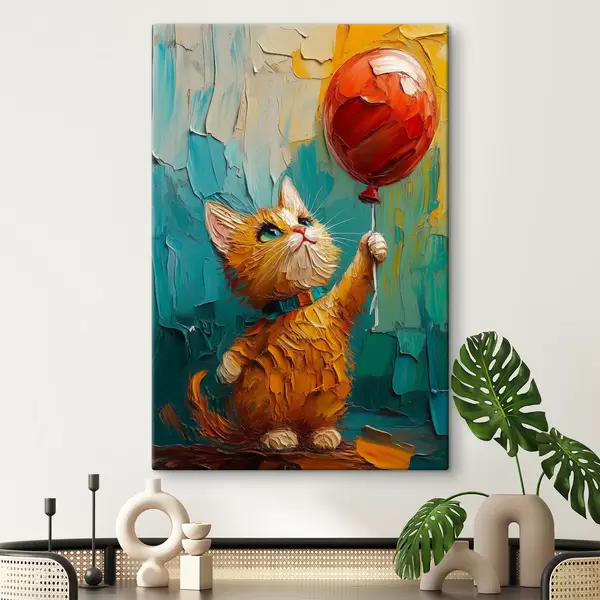 Wandbilder Rote Katze hält einen Luftballon in den Händen, Nachahmung eines Ölgemäldes Art. s40649