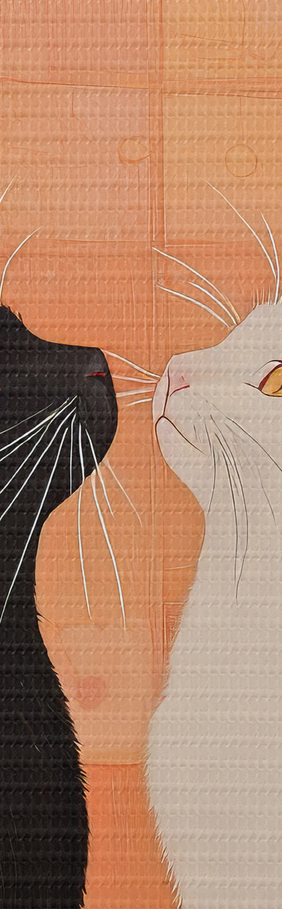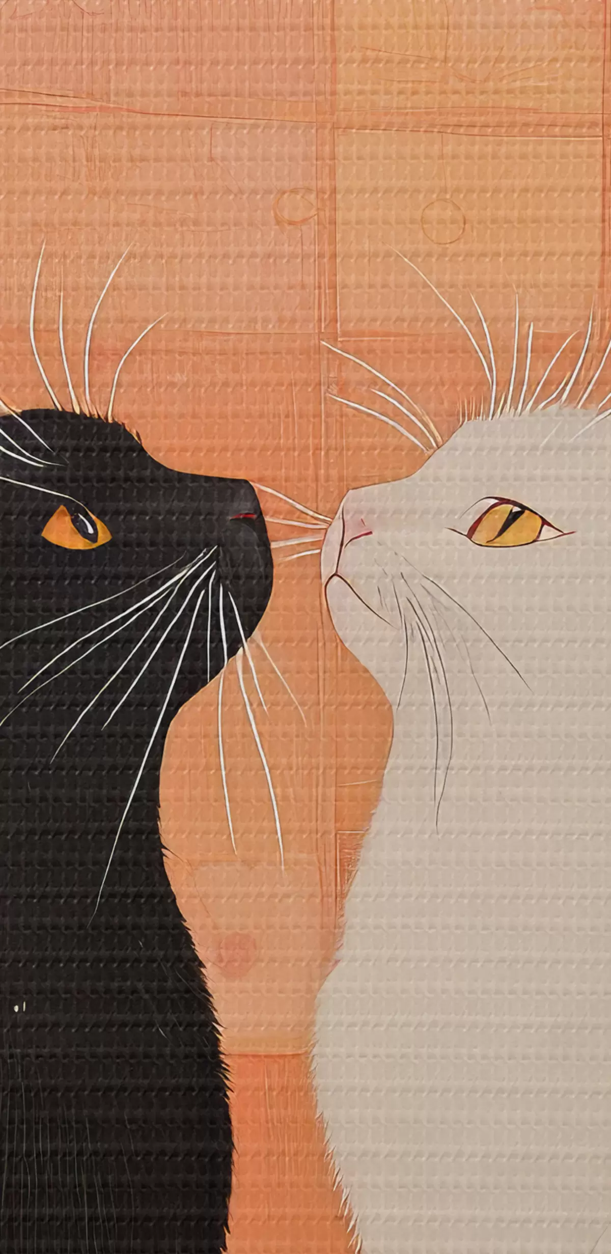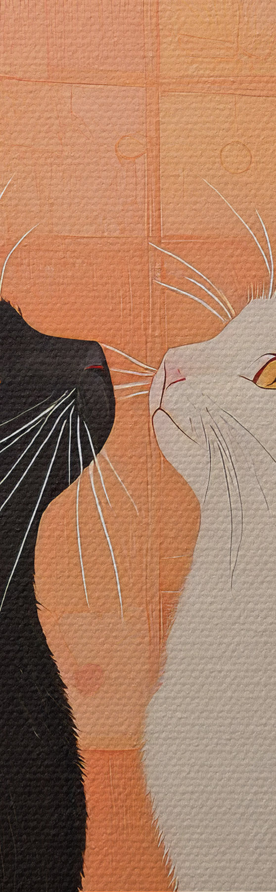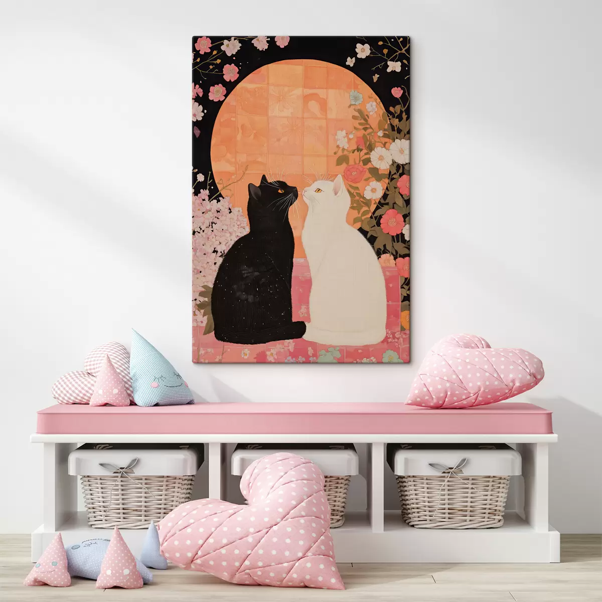 Wandbilder Schwarze und weiße Katze schauen sich bei Sonnenuntergang niedlich an Art. s40669