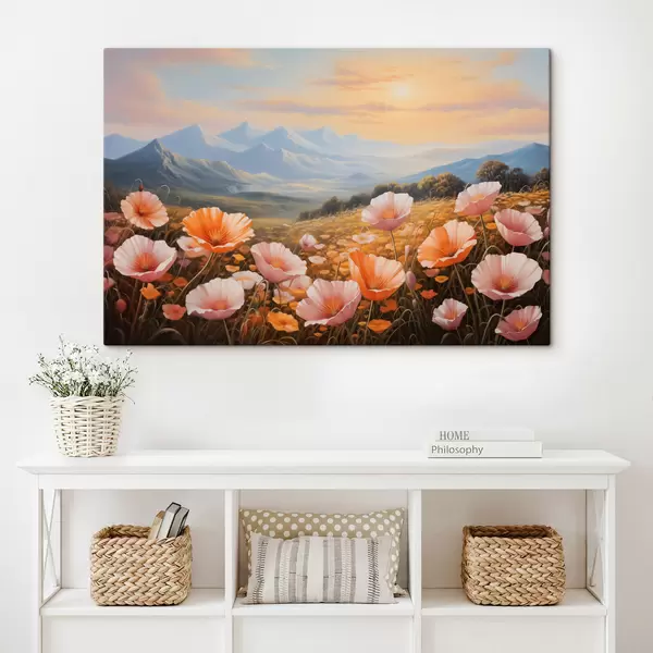 Wandbilder Mohnfeld in der Morgendämmerung mit Bergen im Hintergrund Art. s40730