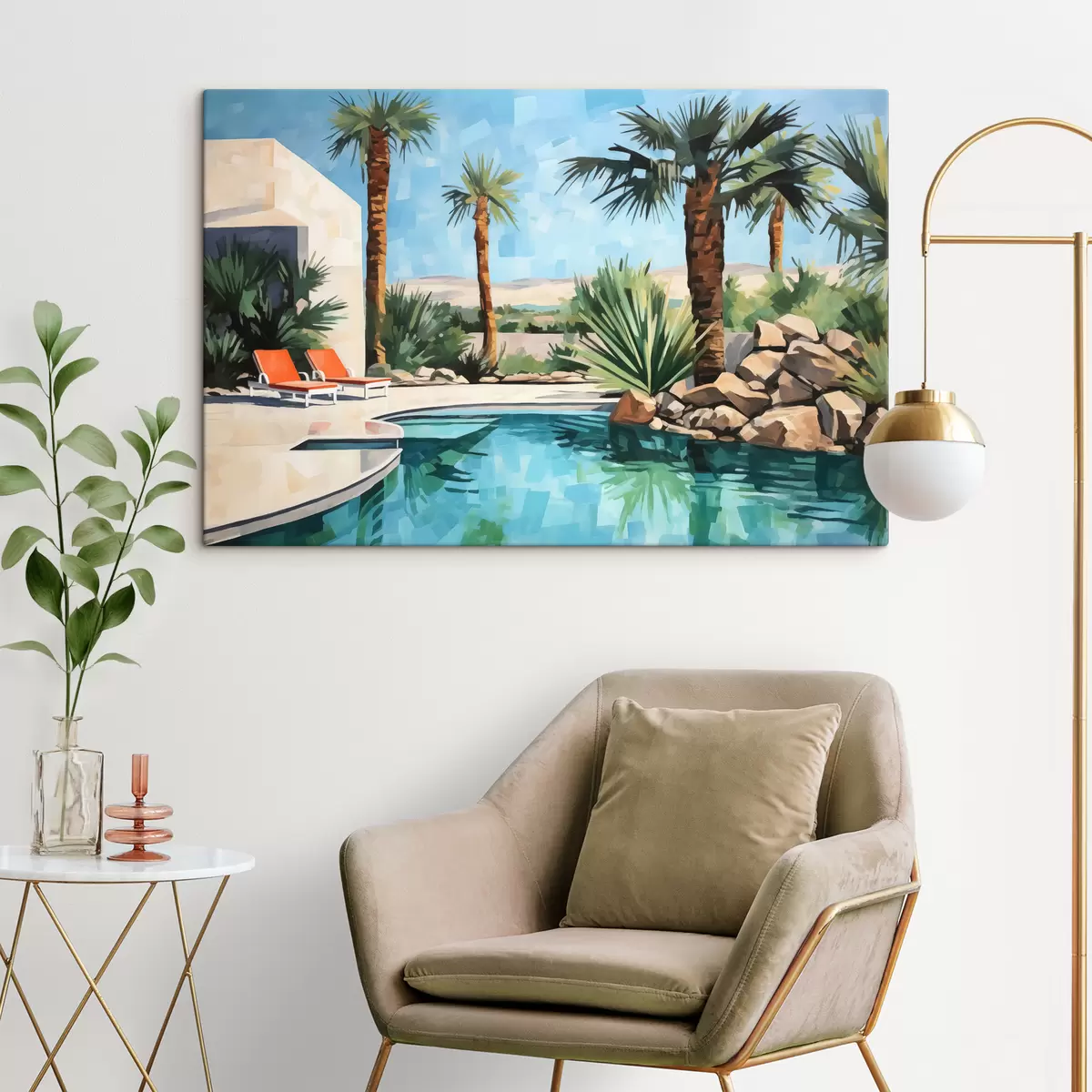Wandbilder Palmen in der Nähe des Hotels mit einem Schwimmbad in der Nähe der Felsen, blau, grün, rot Farbe Art. s40748