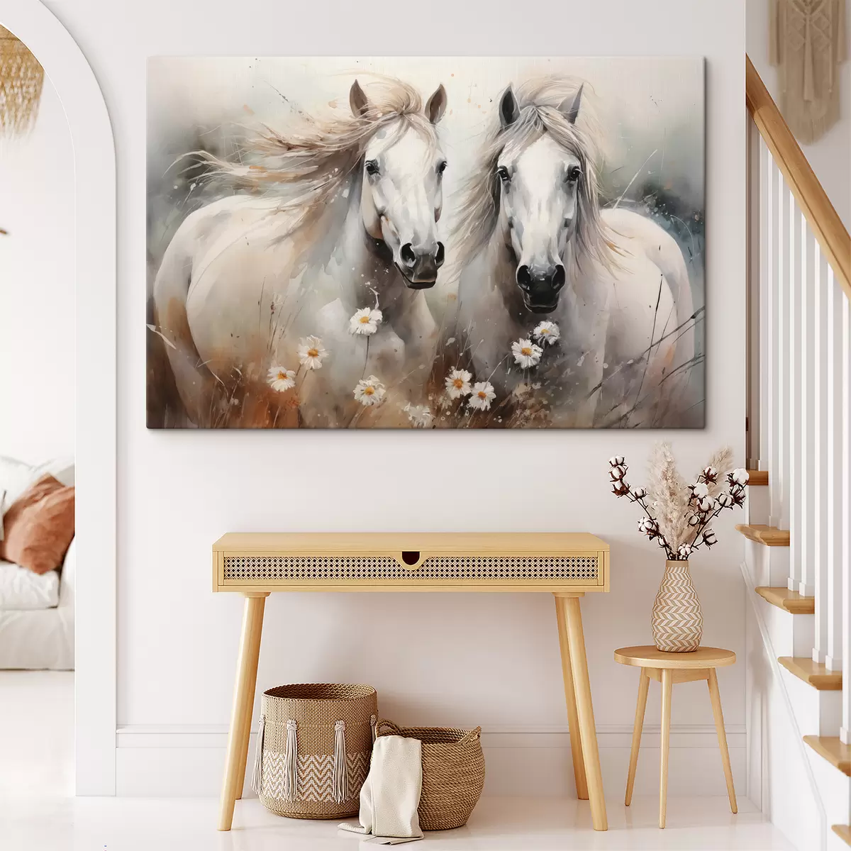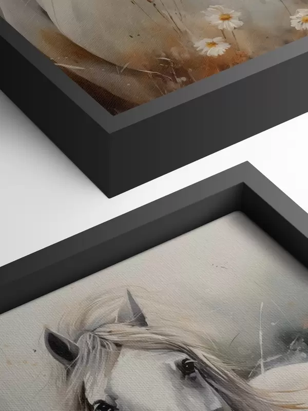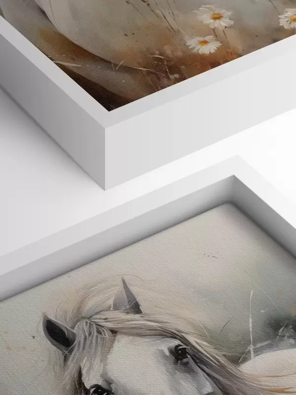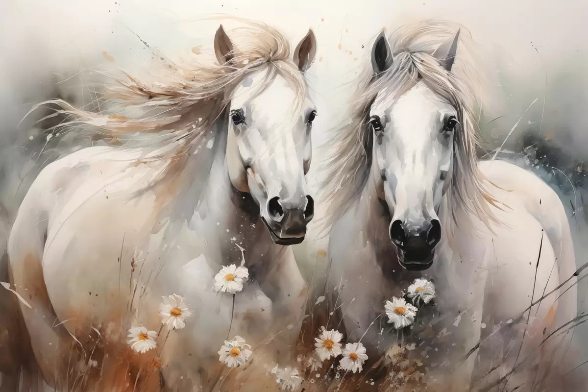 Wandbilder Ein Paar weißer und grauer Pferde in der Nähe von Gänseblümchen Art. s40749
