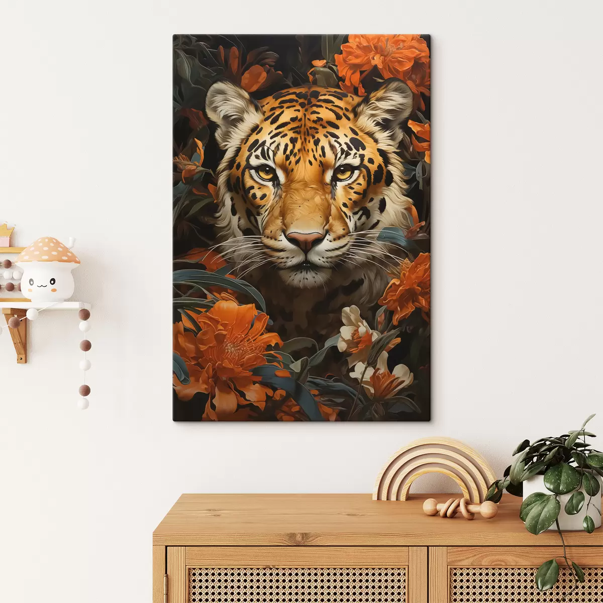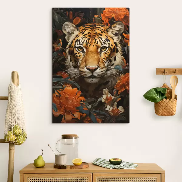 Wandbilder Porträt eines Tigers, umgeben von tropischen Blumen Art. s40757