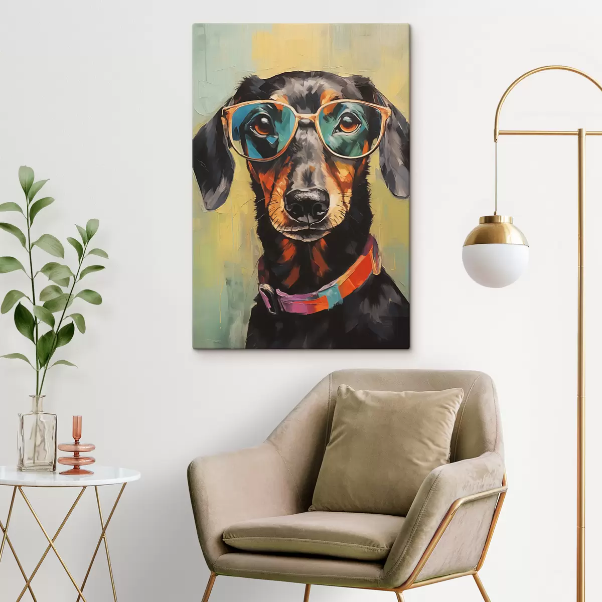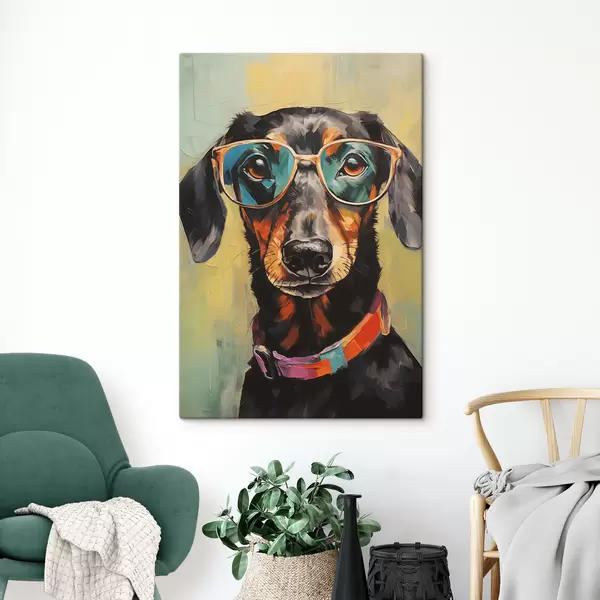 Wandbilder Porträt eines schwarzen Dackels mit Brille Art. s40803
