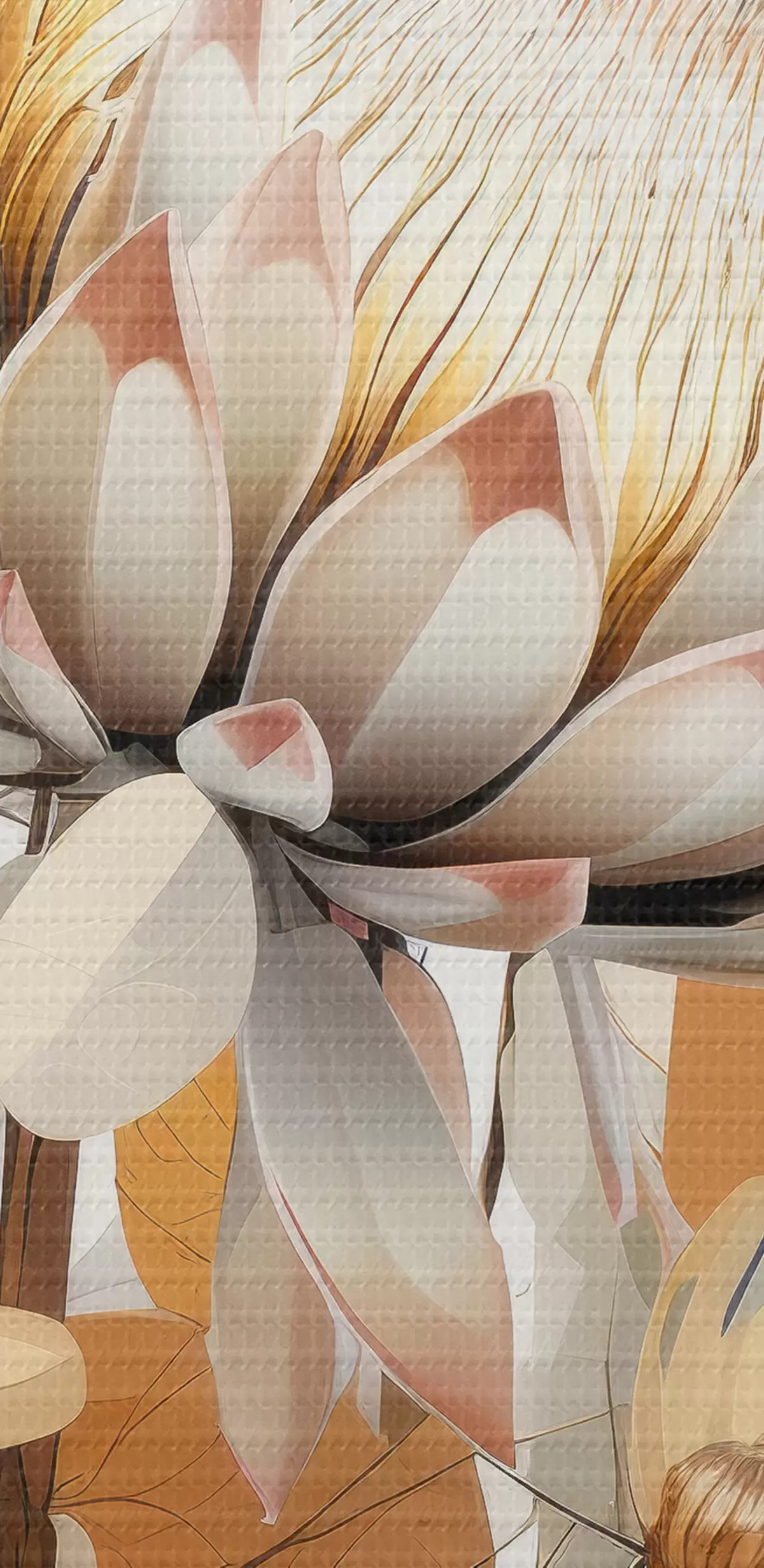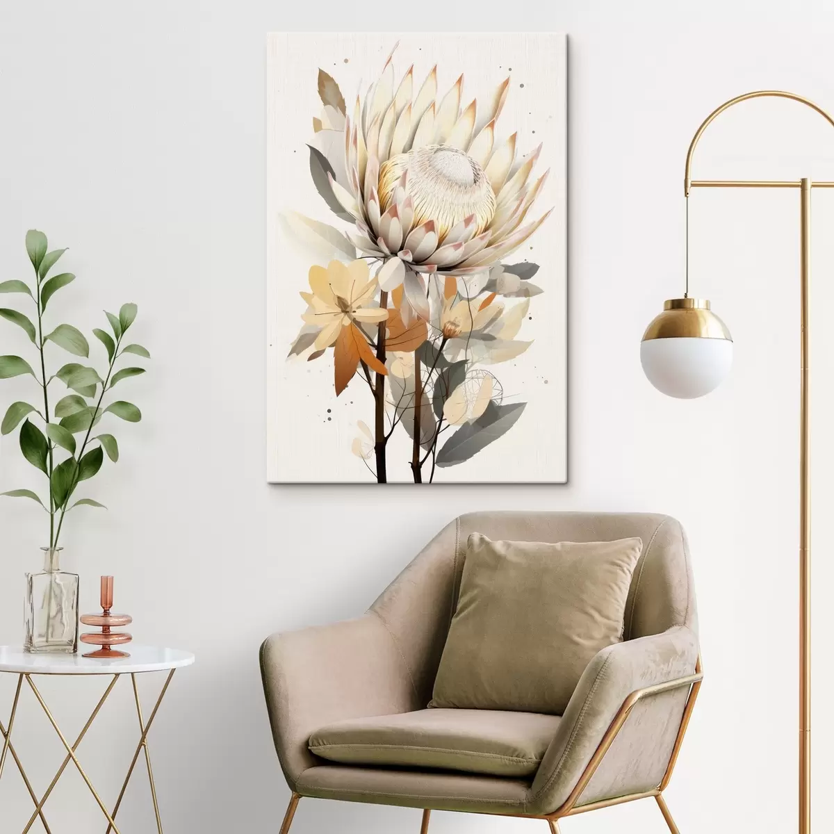 Wandbilder Schöne Protea-Blüten mit üppigen Blättern, weiche Beigetöne, Baumwolle Art. s40817