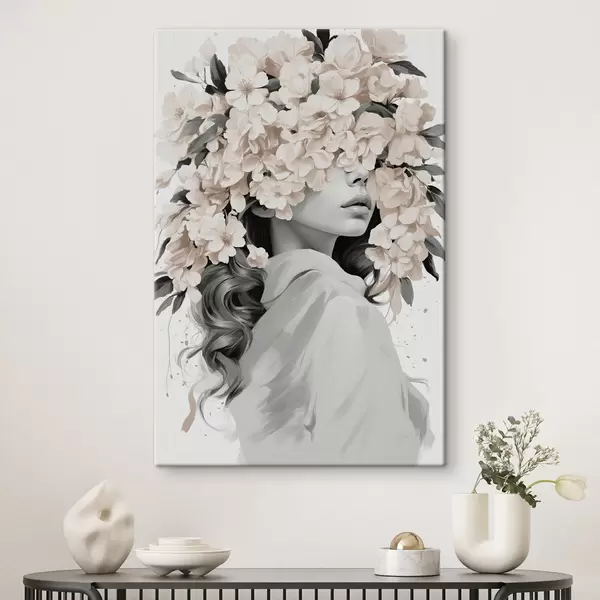 Wandbilder Mädchen mit Blumen im Gesicht in schwarzen und weißen Farben Art. s40849