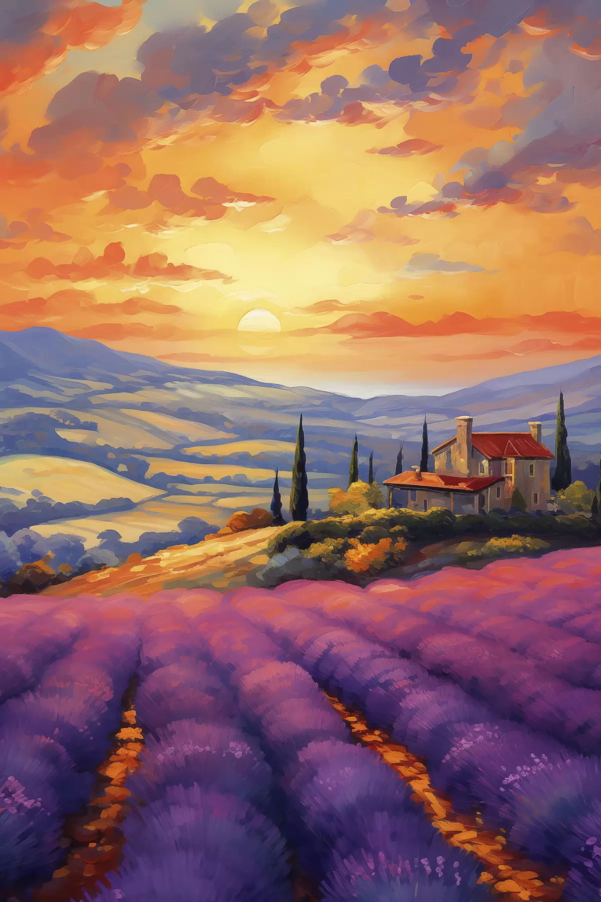 Wandbilder Toskana Sonnenuntergang, Lavendelfelder, schöne Landschaften, Aquarell s40942