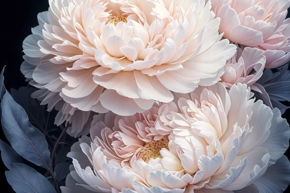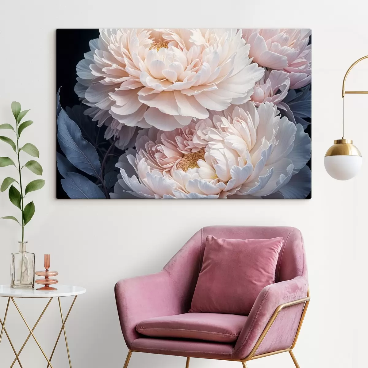 Wandbilder Zarte pastellrosa Pfingstrosen mit weichen, flauschigen Blütenblättern und blauen Blättern vor dunklem Hintergrund s41092