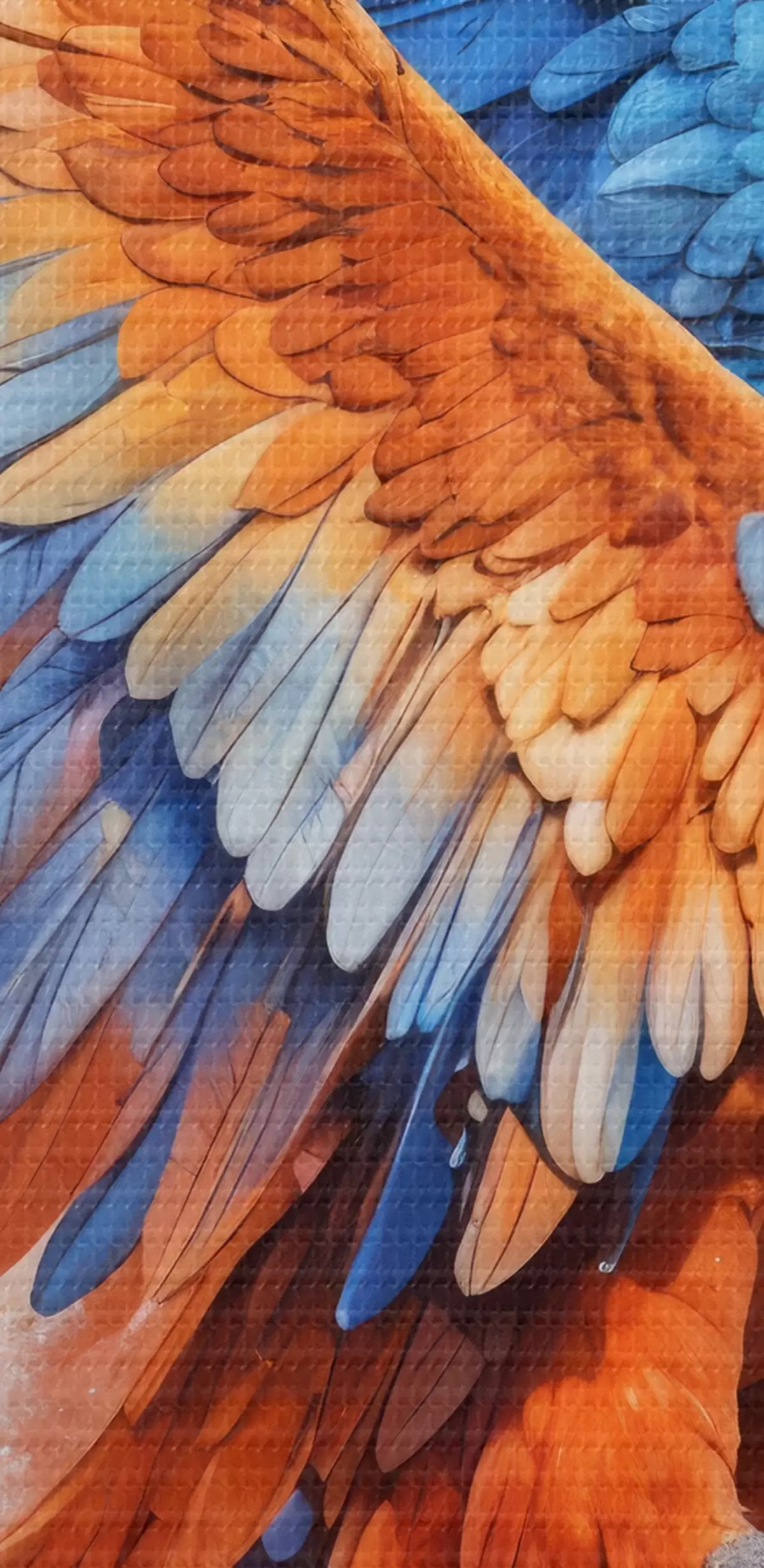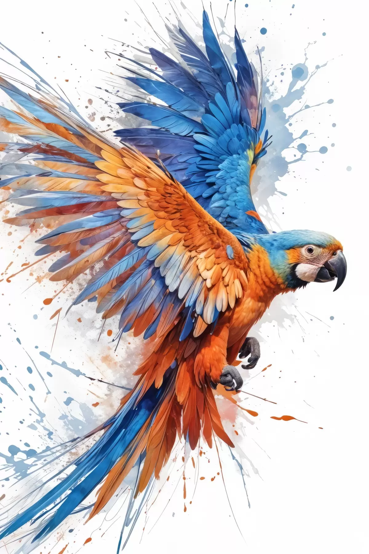 Wandbilder Ein bunter Papagei mit leuchtend blauen, orangefarbenen und gelben Federn im Flug vor einem gesprenkelten Hintergrund s41250