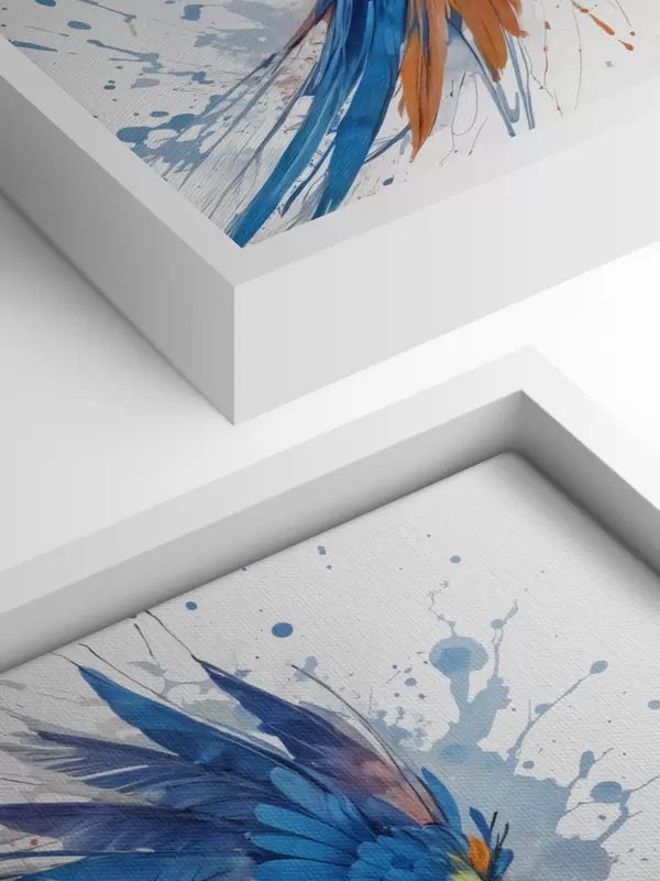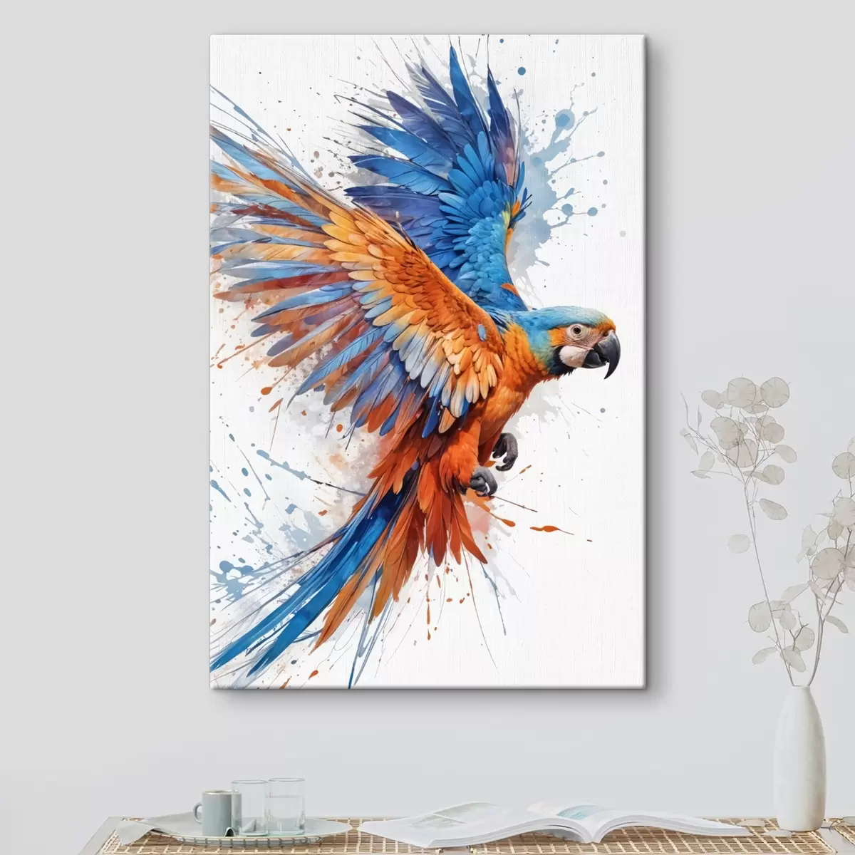 Wandbilder Ein bunter Papagei mit leuchtend blauen, orangefarbenen und gelben Federn im Flug vor einem gesprenkelten Hintergrund Art. s41250