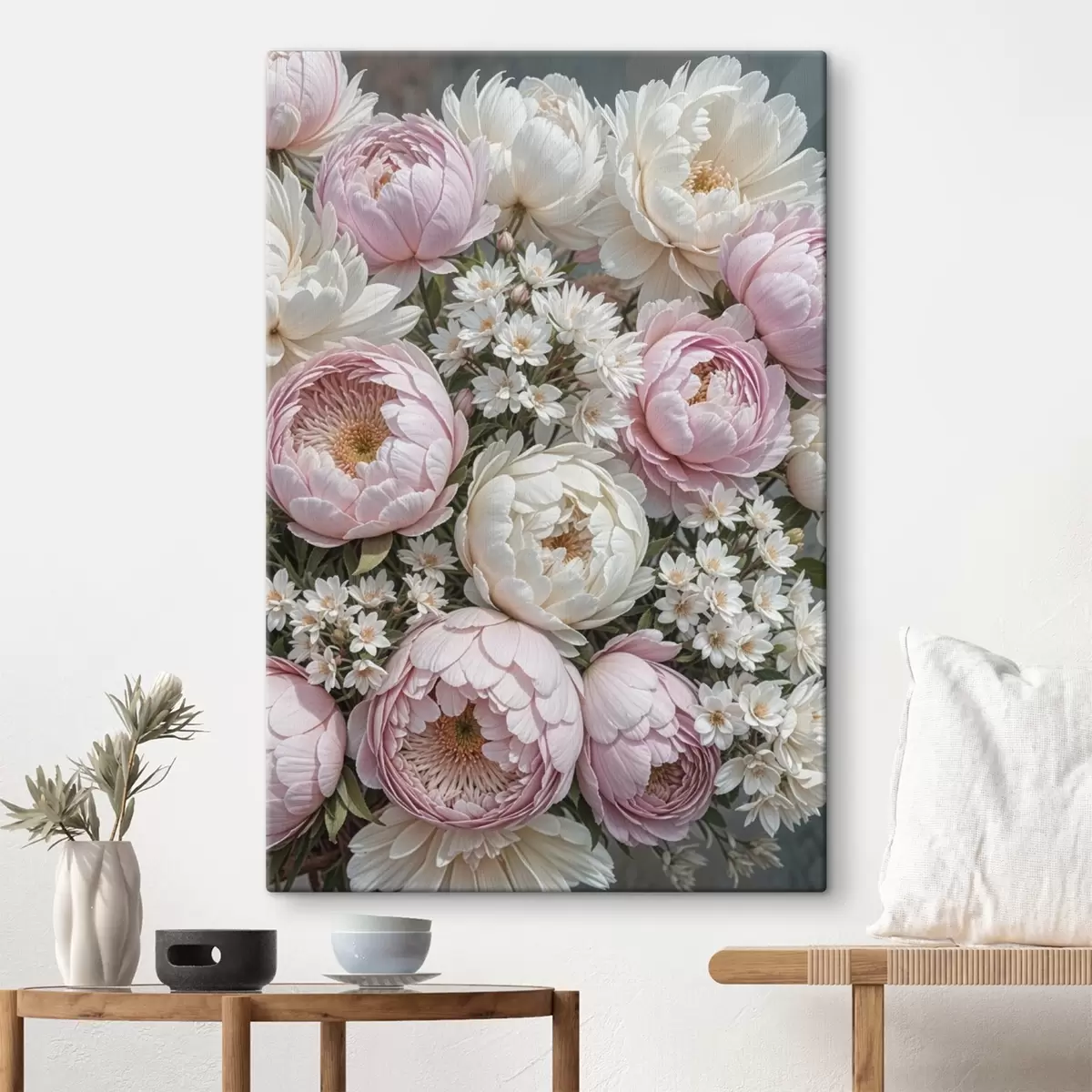 Wandbilder Ein Strauß aus pastellrosa Pfingstrosen und weißen Gänseblümchen, arrangiert in einer schönen Blumenkomposition Art. s41255