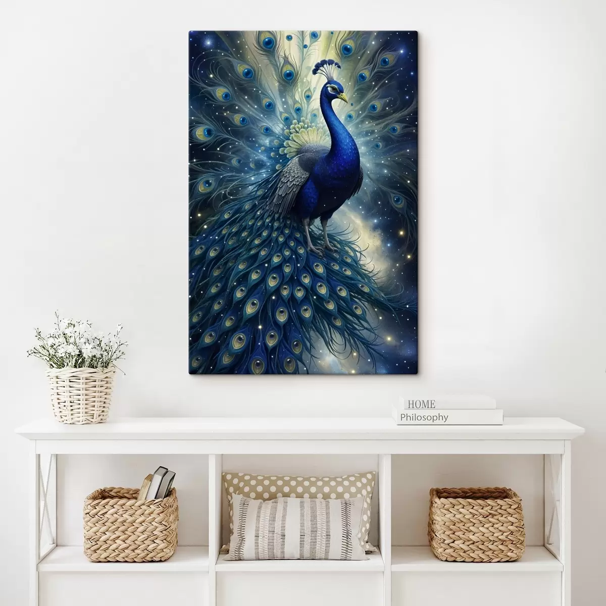 Wandbilder Ein leuchtender und majestätischer Pfau vor einem nächtlichen Sternenhimmel, der eine magische und ätherische Atmosphäre schafft Art. s41256