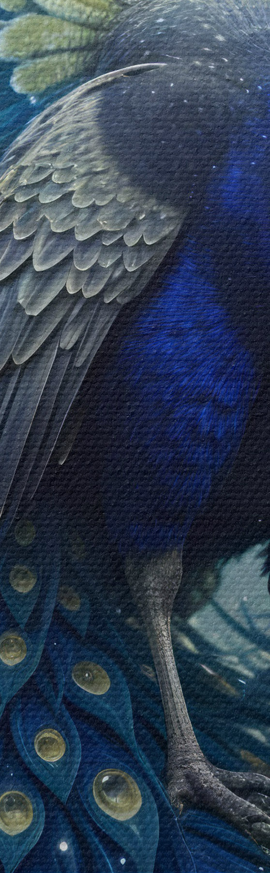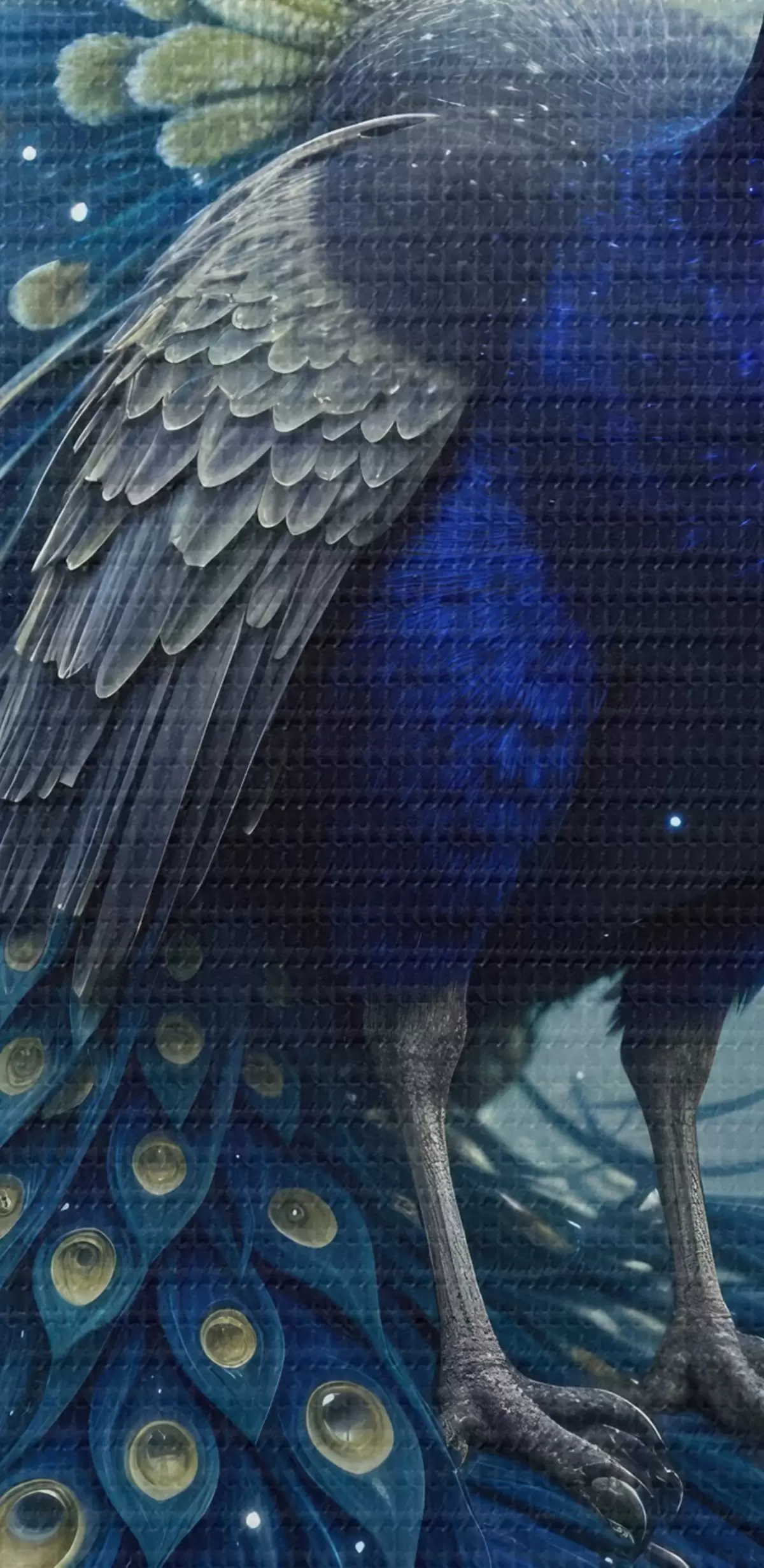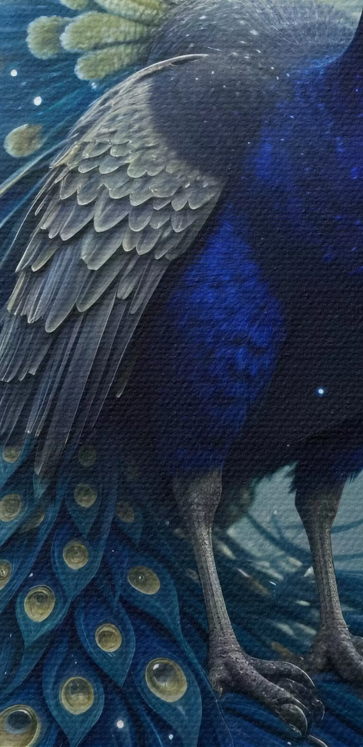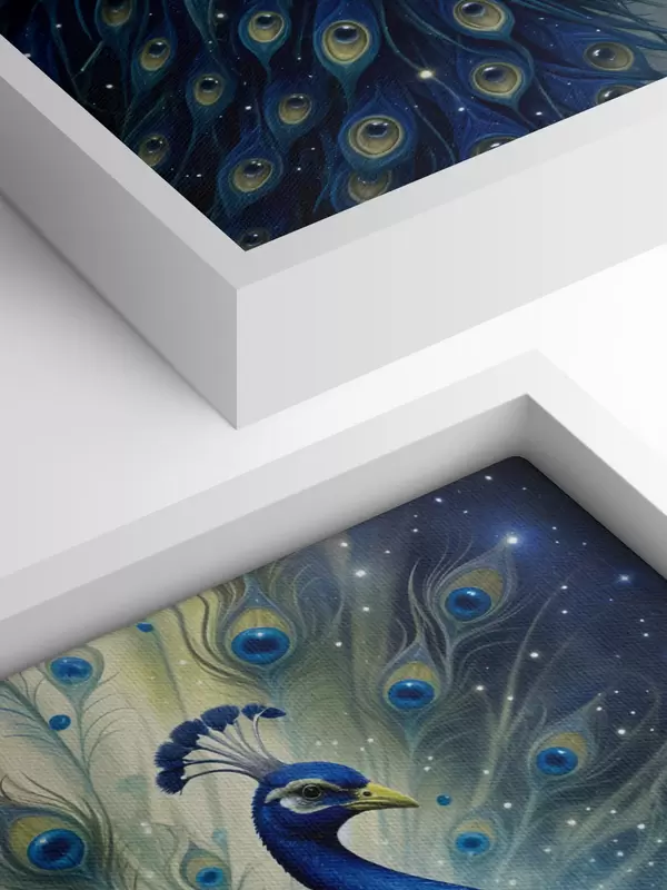 Wandbilder Ein leuchtender und majestätischer Pfau vor einem nächtlichen Sternenhimmel, der eine magische und ätherische Atmosphäre schafft s41256