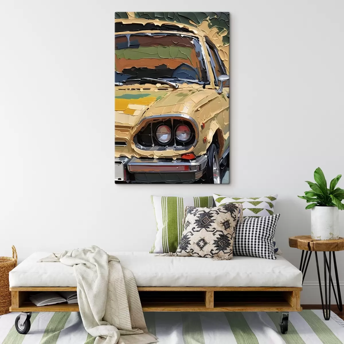 Wandbilder Nachahmung eines pastosen Ölgemäldes eines gelben Autos vor einem bunten, abstrakten Hintergrund s41261