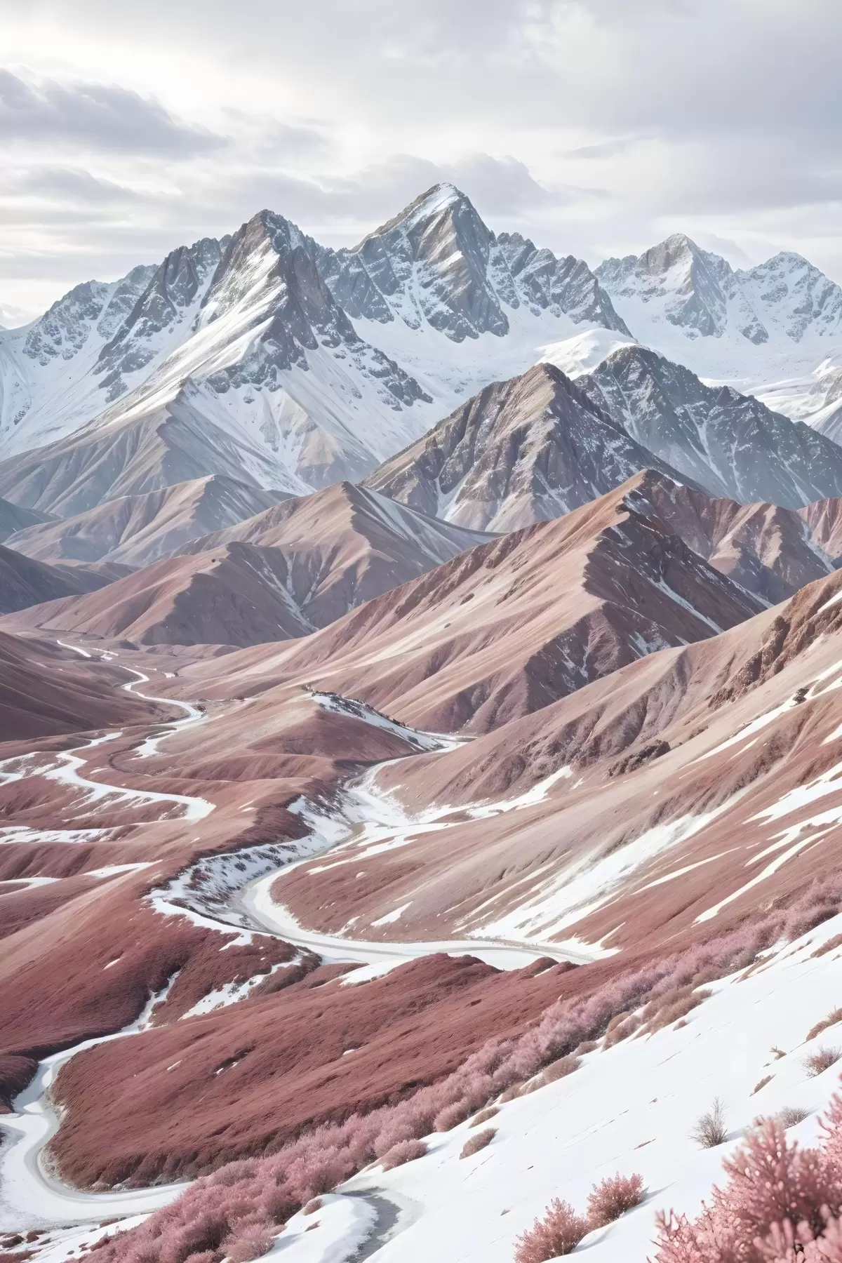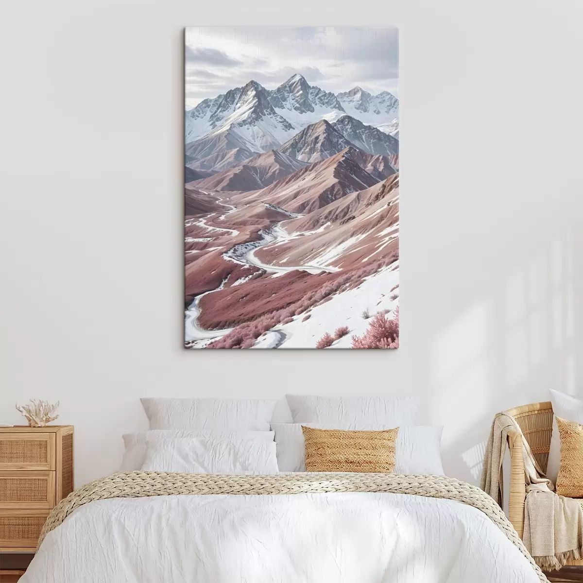 Wandbilder Schroffe, schneebedeckte Berge mit einem sich windenden Fluss, der durch eine weite, farbenfrohe Landschaft fließt Art. s41262