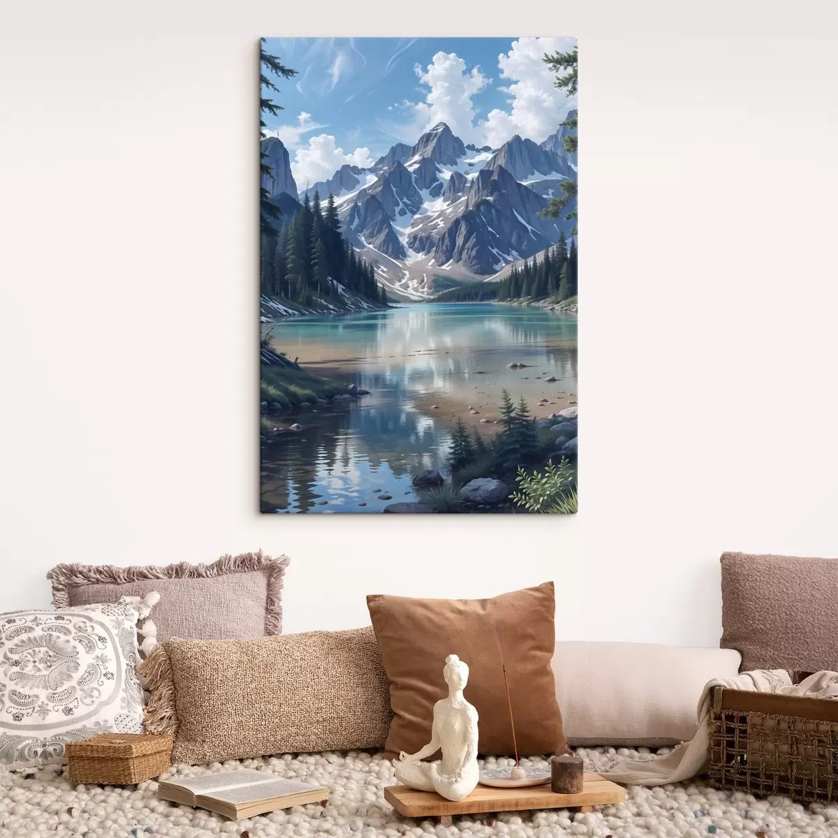 Wandbilder Ein ruhiger Alpensee, umgeben von majestätischen schneebedeckten Bergen, mit einem dichten Wald und einem bewölkten Himmel Art. s41264