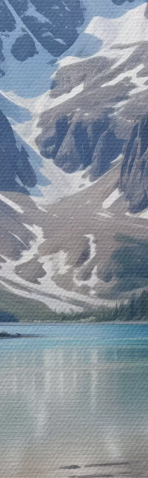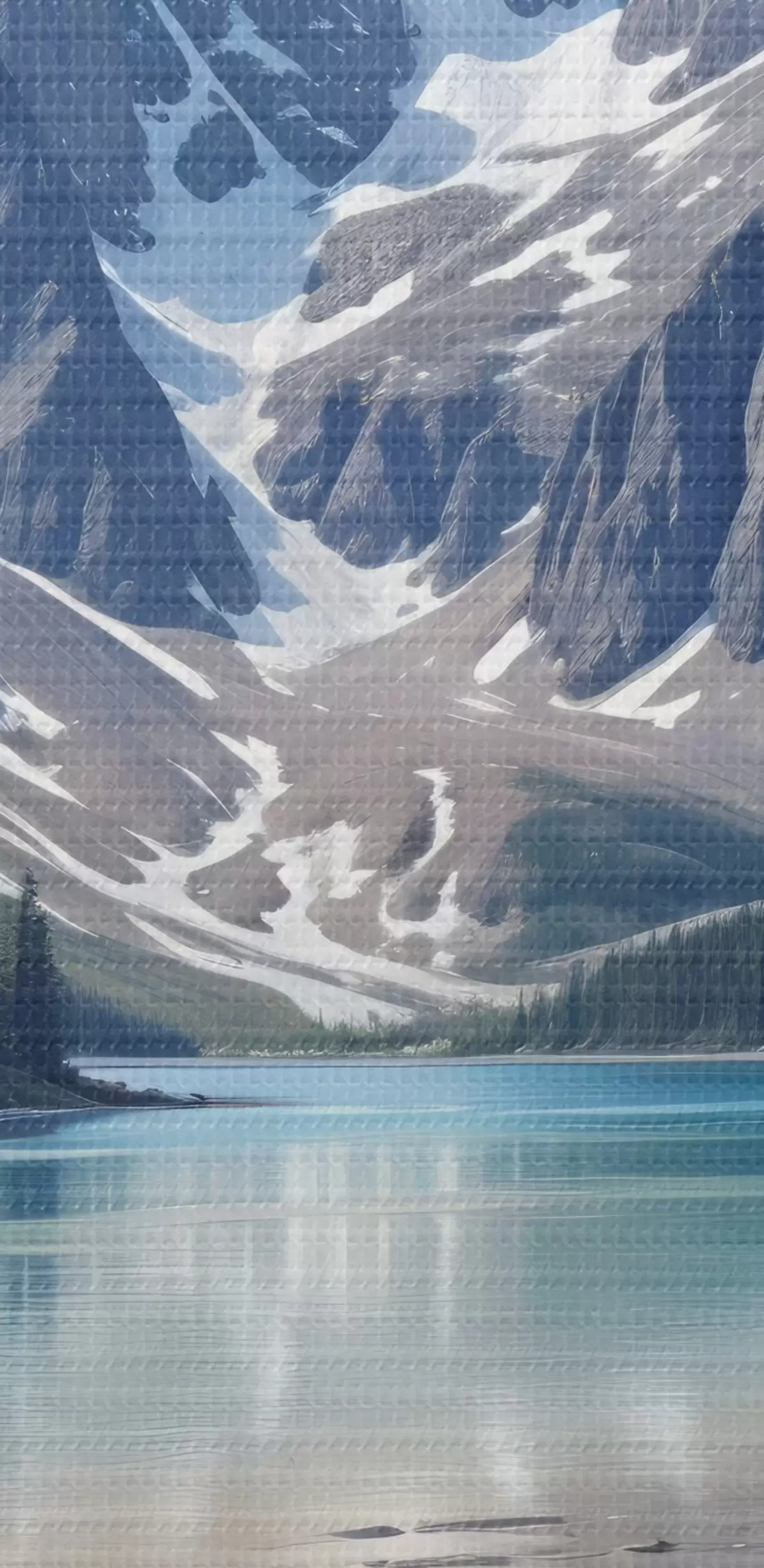 Wandbilder Ein ruhiger Alpensee, umgeben von majestätischen schneebedeckten Bergen, mit einem dichten Wald und einem bewölkten Himmel s41264