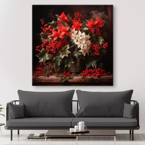 Wandbilder Blumenstrauß mit Stechpalme und Weihnachtsblumen auf dunklem Hintergrund Art. s41272