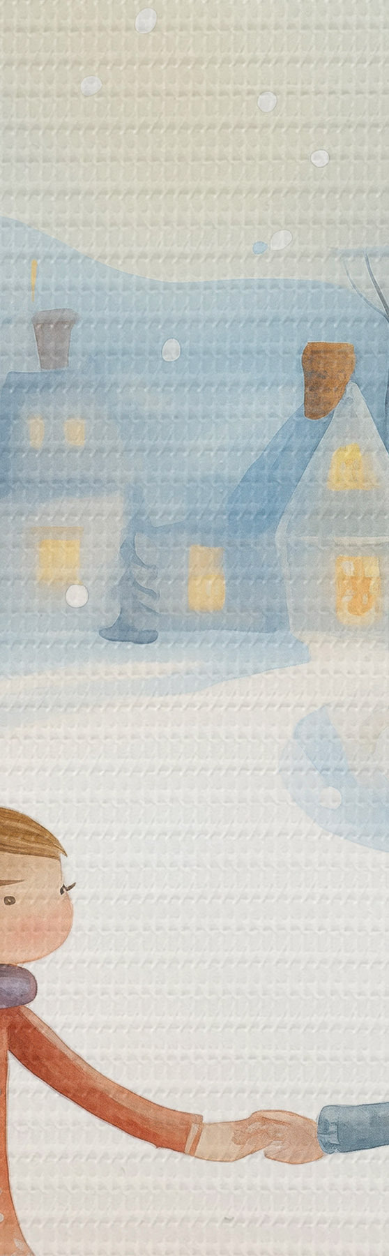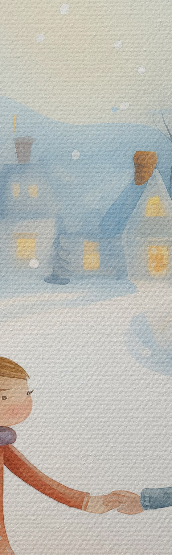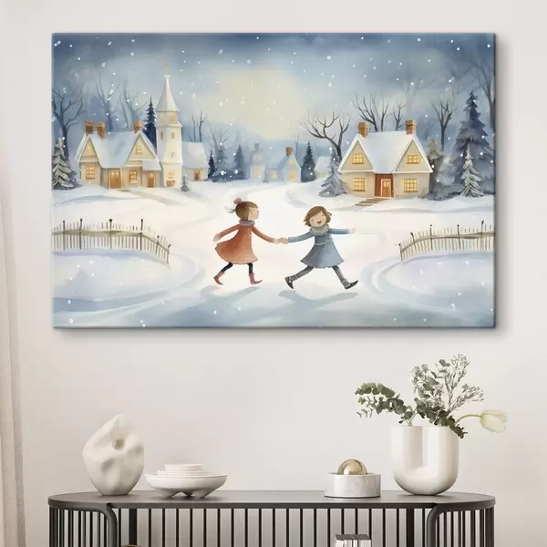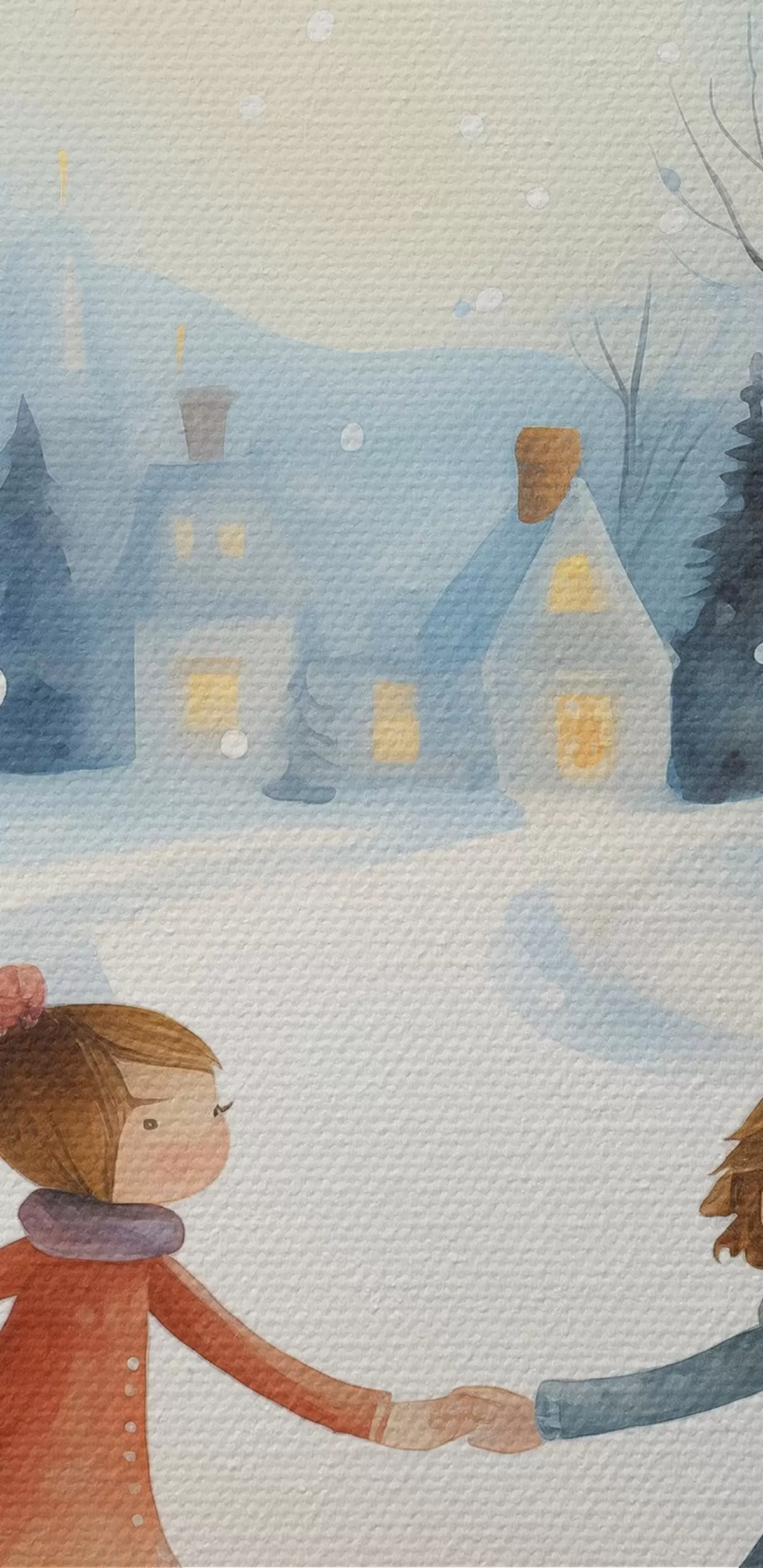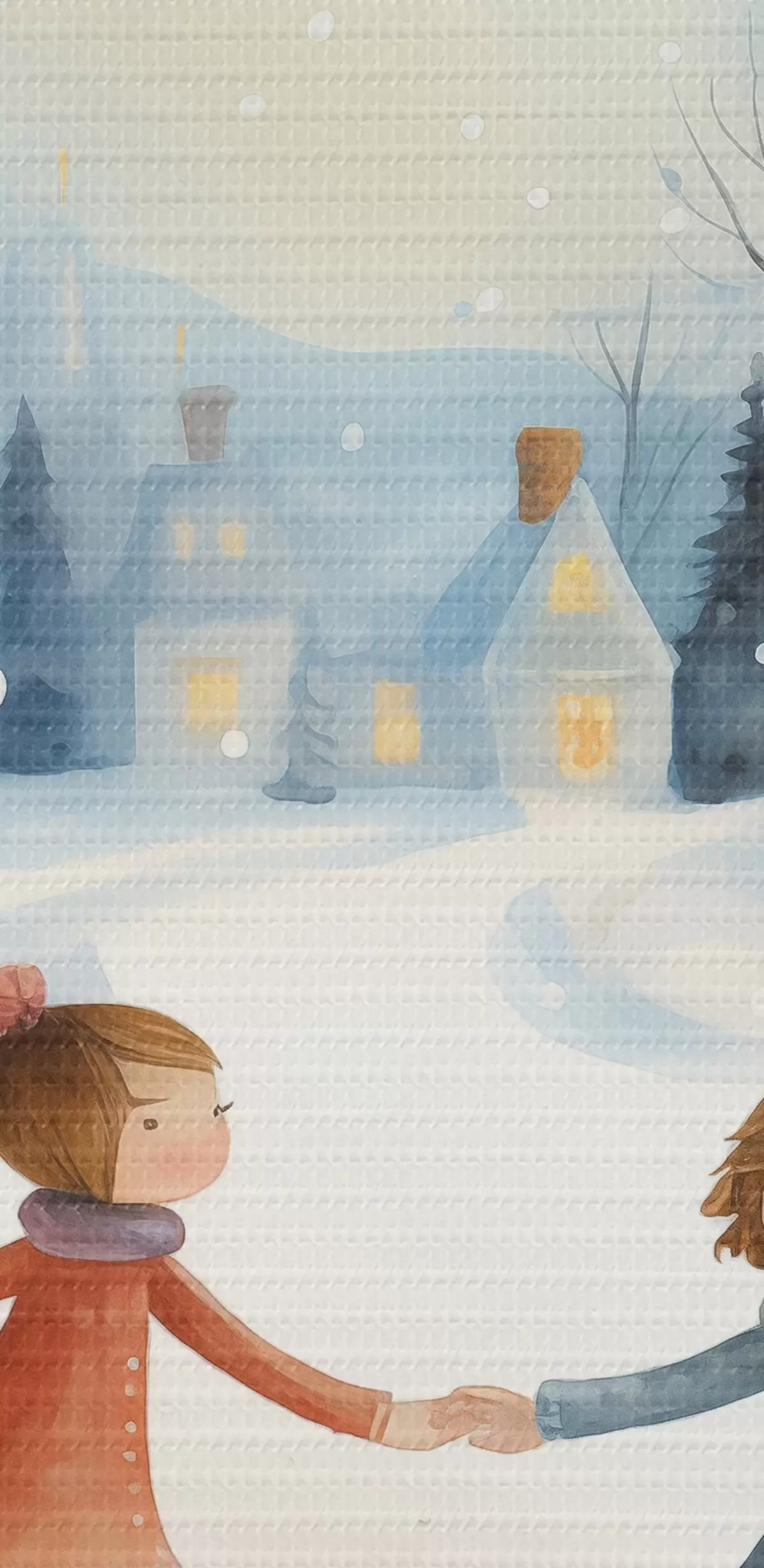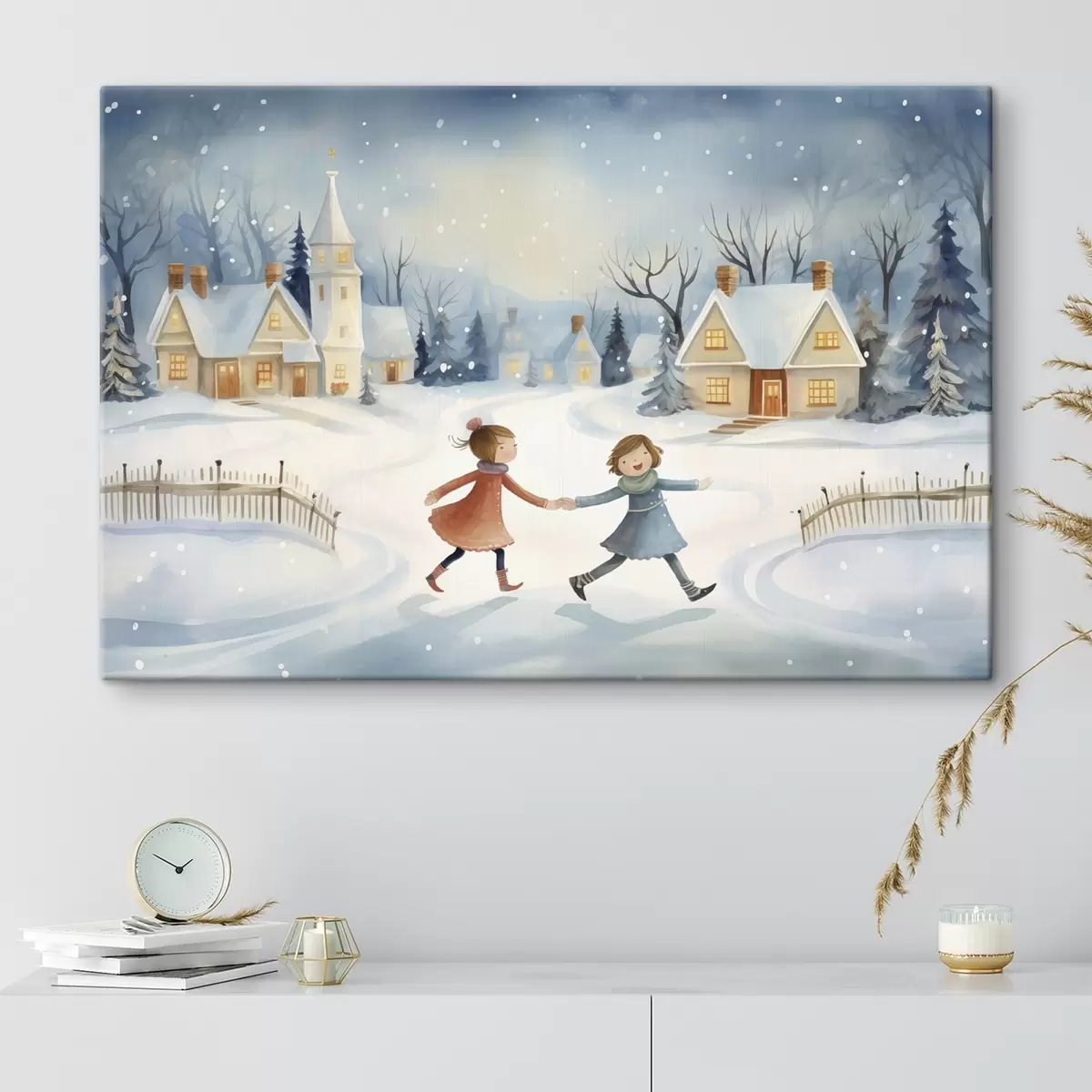 Wandbilder Mädchen im Winterdorf, Schneeflocken, Aquarell, Häuser, Wald Art. s41385