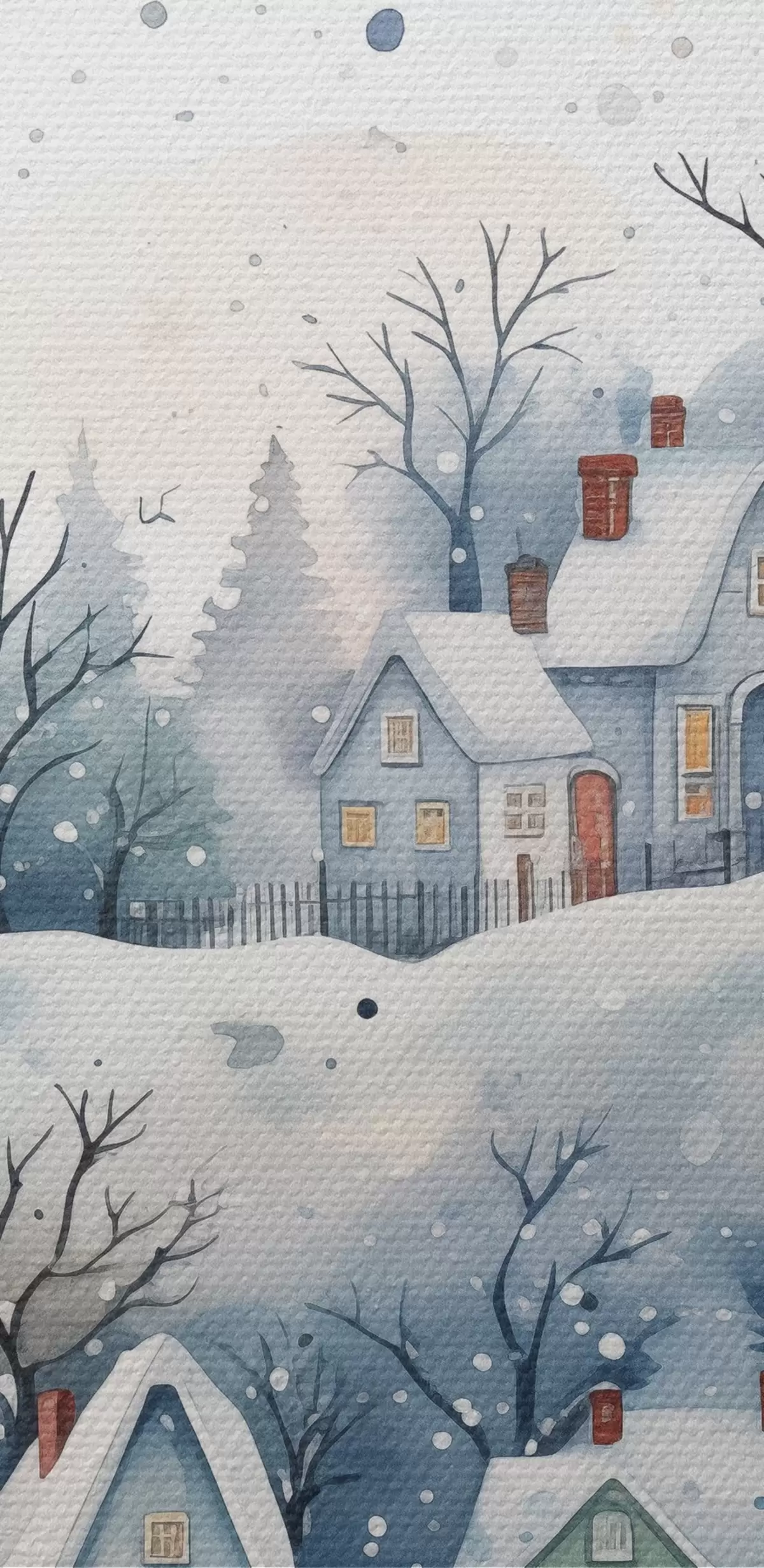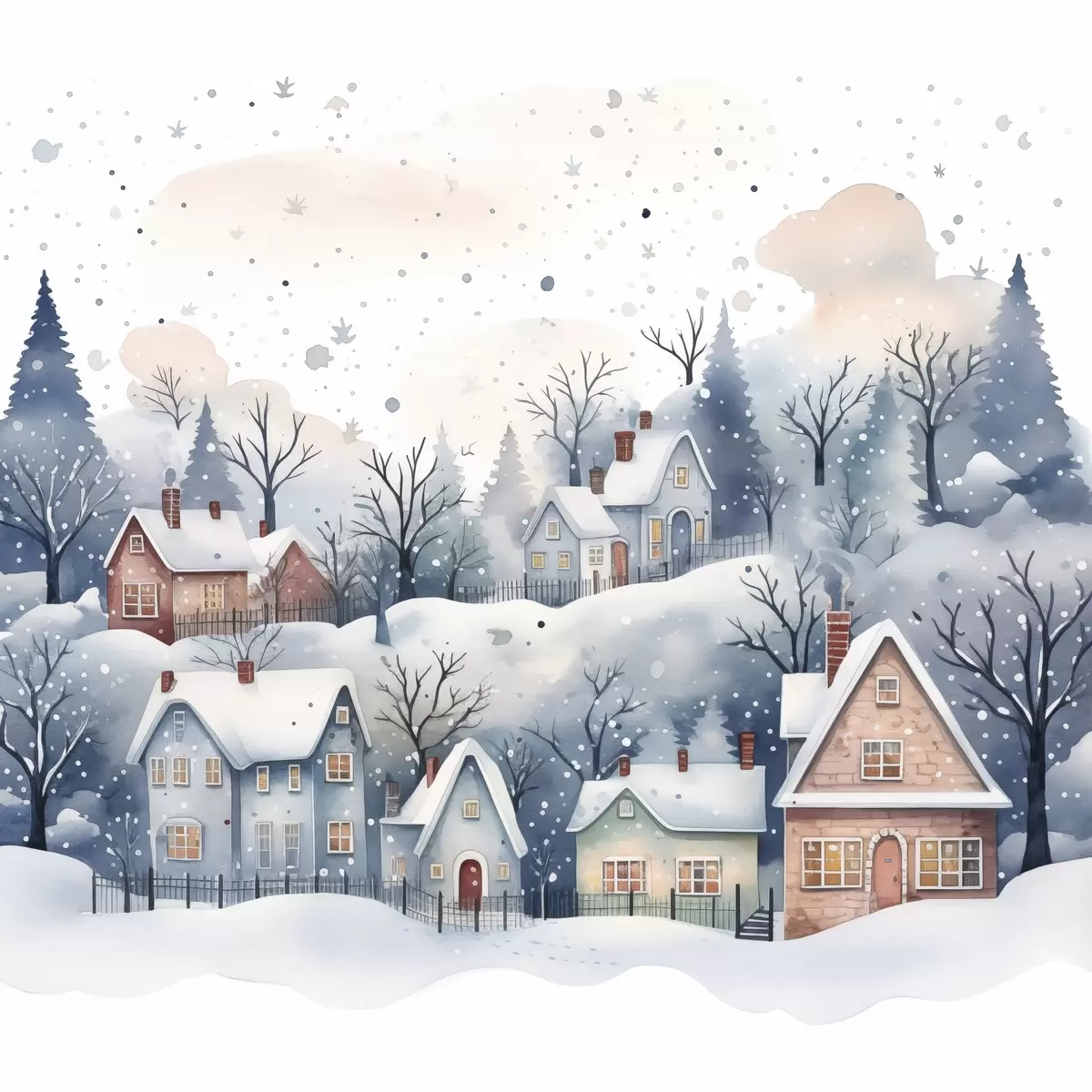 Wandbilder Aquarell Winterlandschaft mit Häusern und Kiefernwald s41389