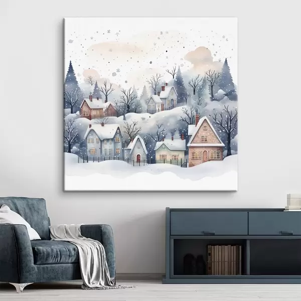 Wandbilder Aquarell Winterlandschaft mit Häusern und Kiefernwald Art. s41389