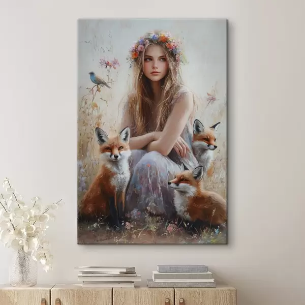 Wandbilder Mädchen auf der Wiese, wilde Tiere, Füchse, Vögel, Blumenkranz s41451