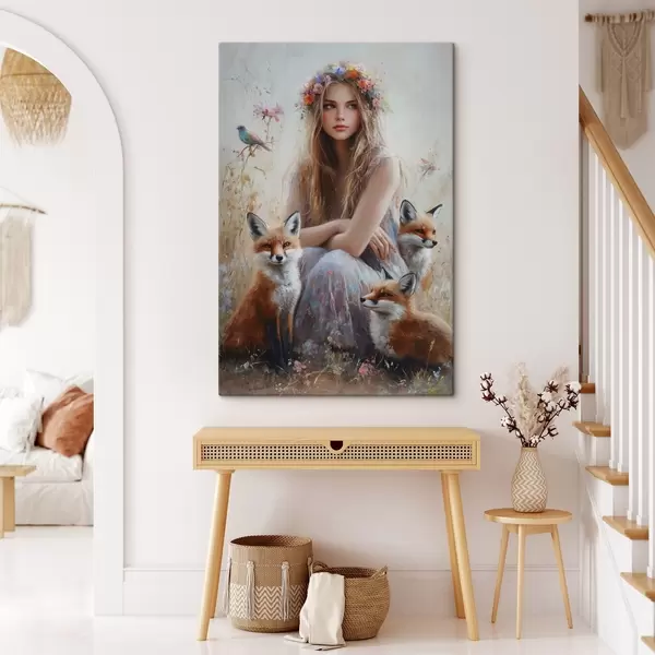 Wandbilder Mädchen auf der Wiese, wilde Tiere, Füchse, Vögel, Blumenkranz s41451