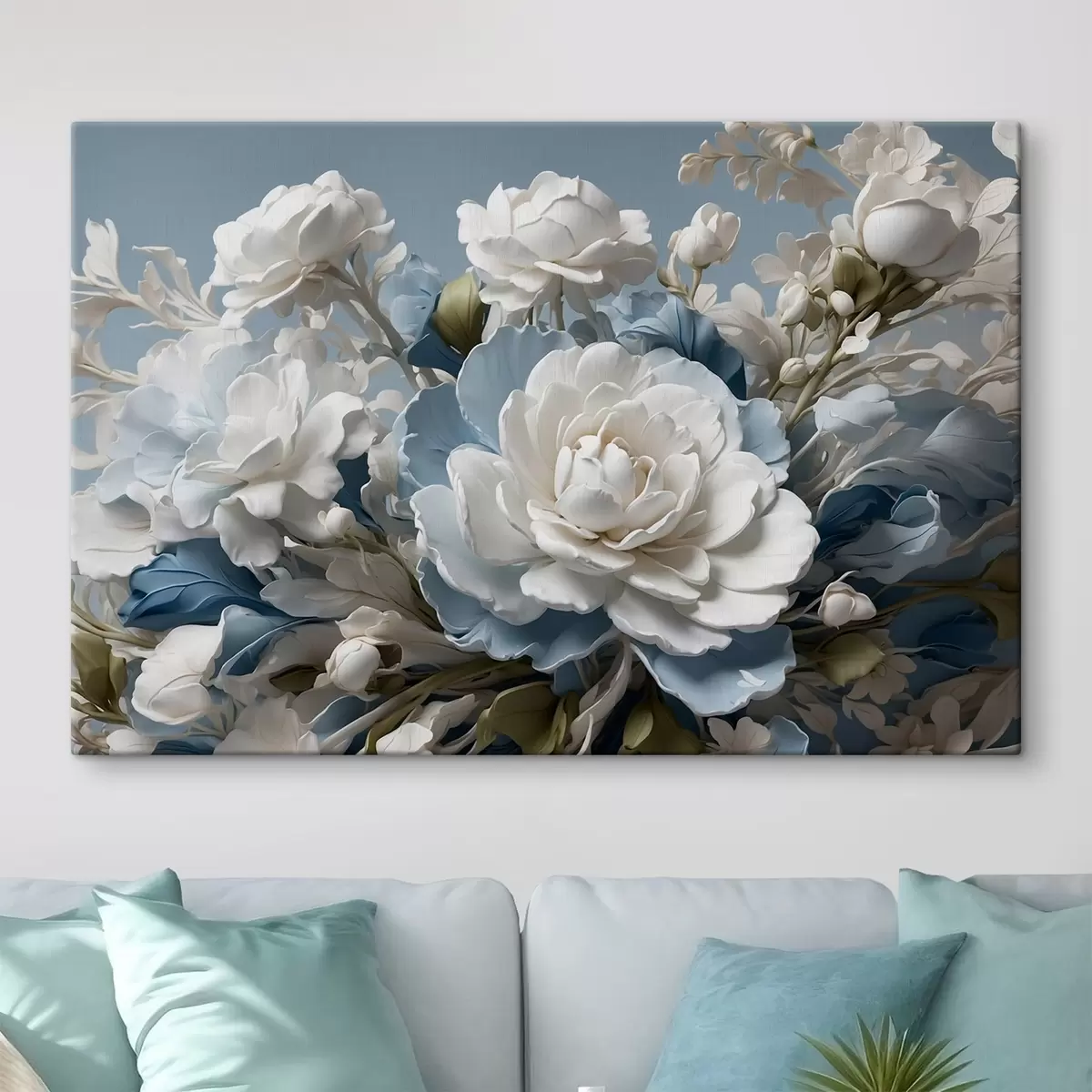 Wandbilder Weiße Blumen und Blätter auf blauem Hintergrund Art. s41527