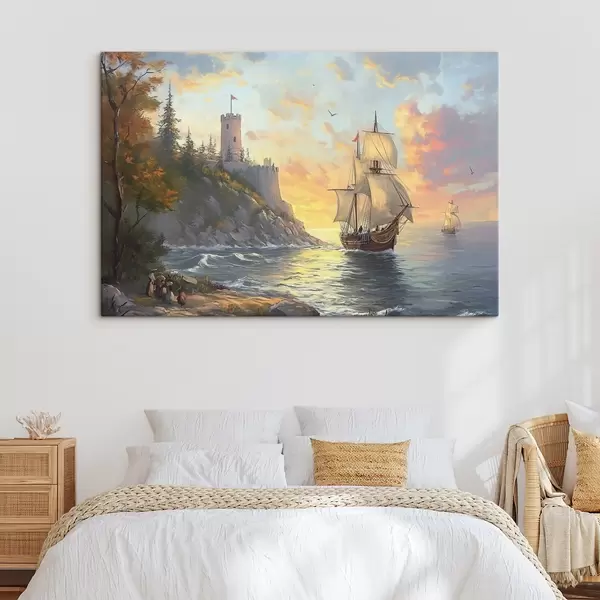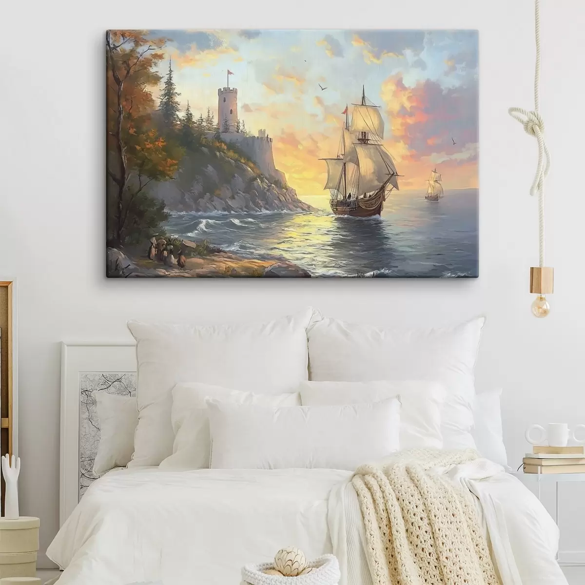 Wandbilder schiff in der Nähe des Ufers in der Morgendämmerung Art. s41626