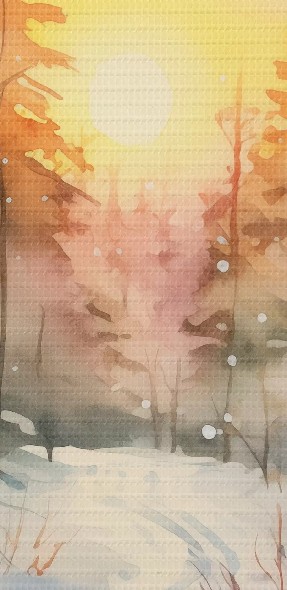 Wandbilder Aquarell Winterwald, Schneeflocken, schöner Himmel, Sonnenuntergang s41640